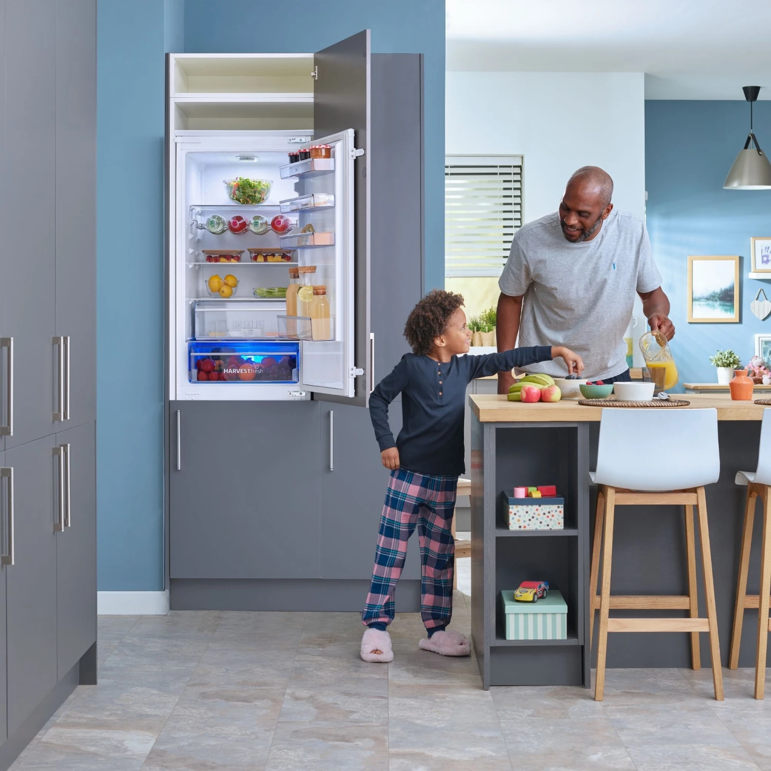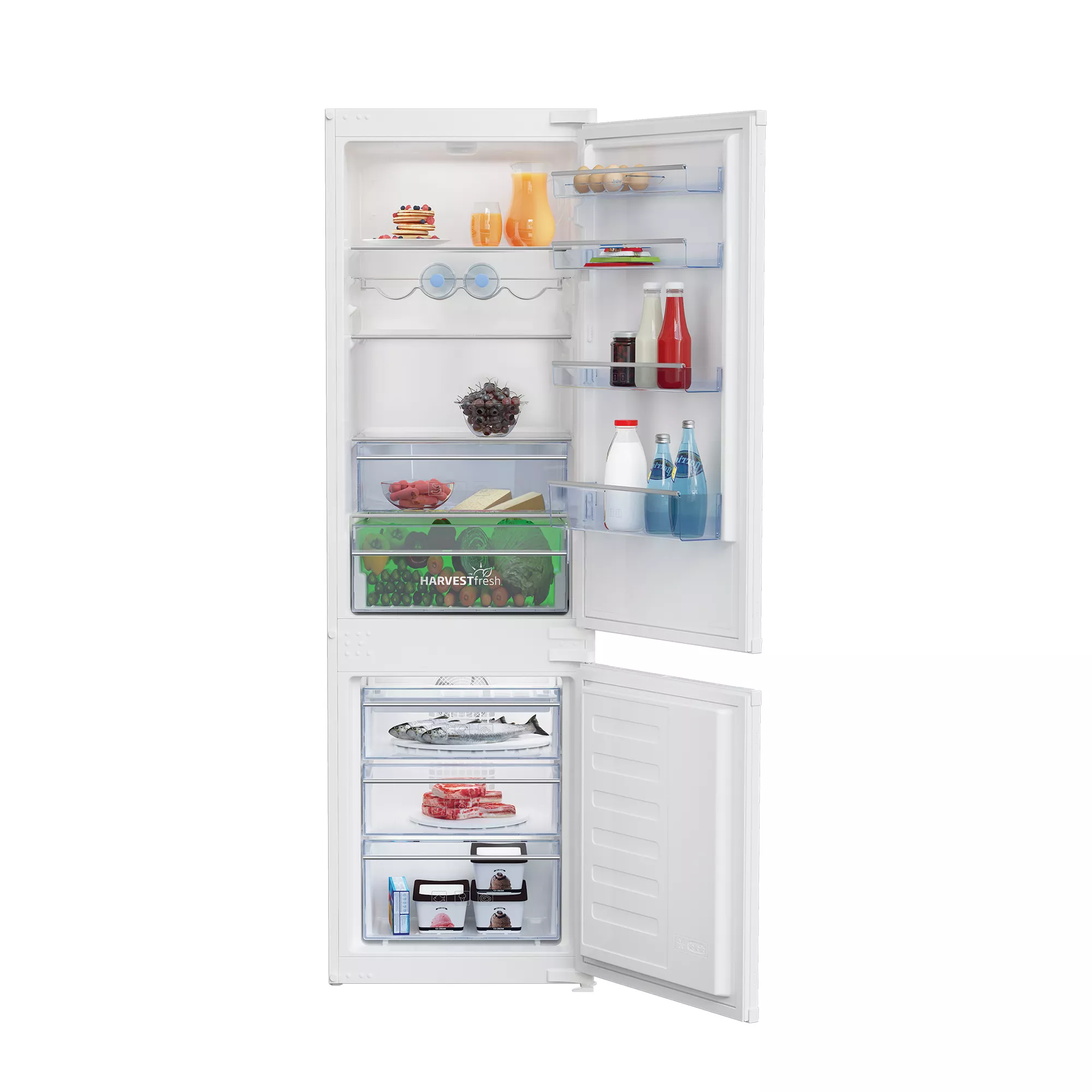 This Beko built in 70/30 combi fridge freezer includes an open door alarm and LED ceiling light. HarvestFreshâ„¢ technology in the crisper drawer helps preserve the taste and vitamins in the fruit or vegetables.