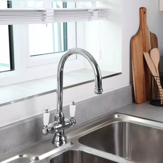 The Franz kitchen tap is perfect for more traditional kitchens, with intricate styling and porcelain details creating a real luxury feel.