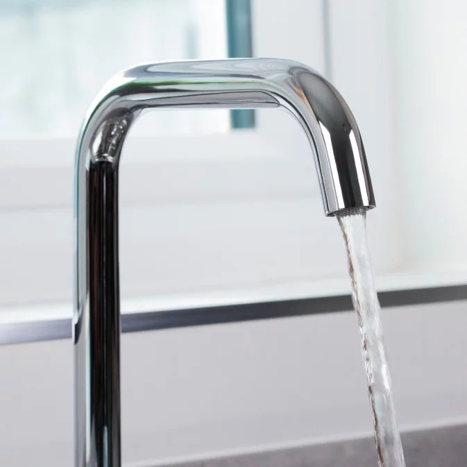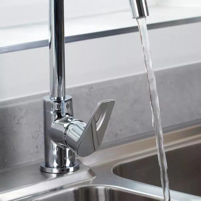 The Vela kitchen tap combines angular lines with curved corners to offer a versatile option along with a large, easy to use, flat handle.