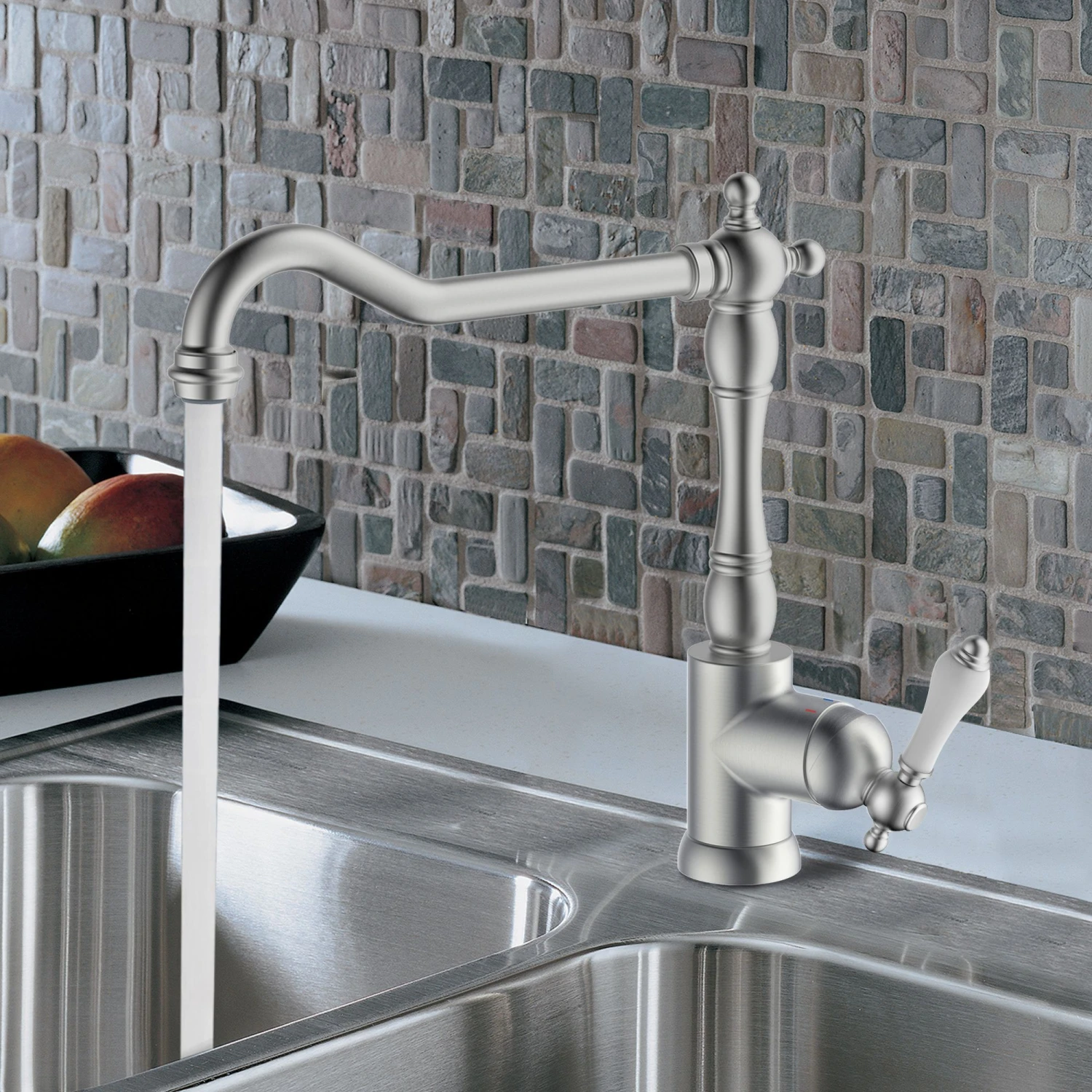 - Combing heritage elements with modern functionality and brushed nickel finish this tap is ideal for those looking to make a style statement. This tap comes with swivel spout and single level control, helping you do the dishes no matter the size of your sink.