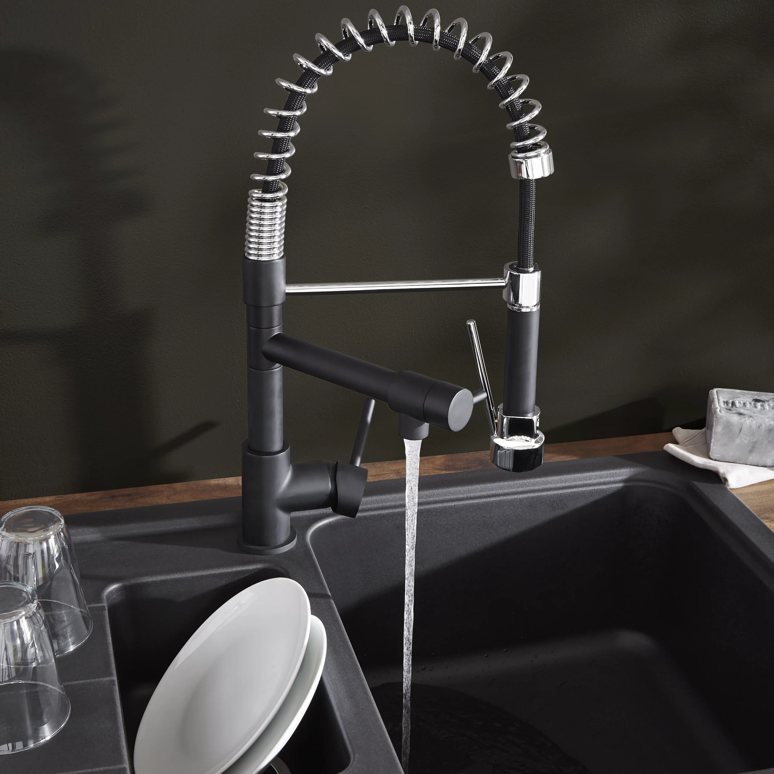 This matt side lever spring neck and spout tap from Cooke and Lewis’ Bilbrough range brings a stylish finishing touch to your kitchen. It’s suitable for high and low pressure systems.