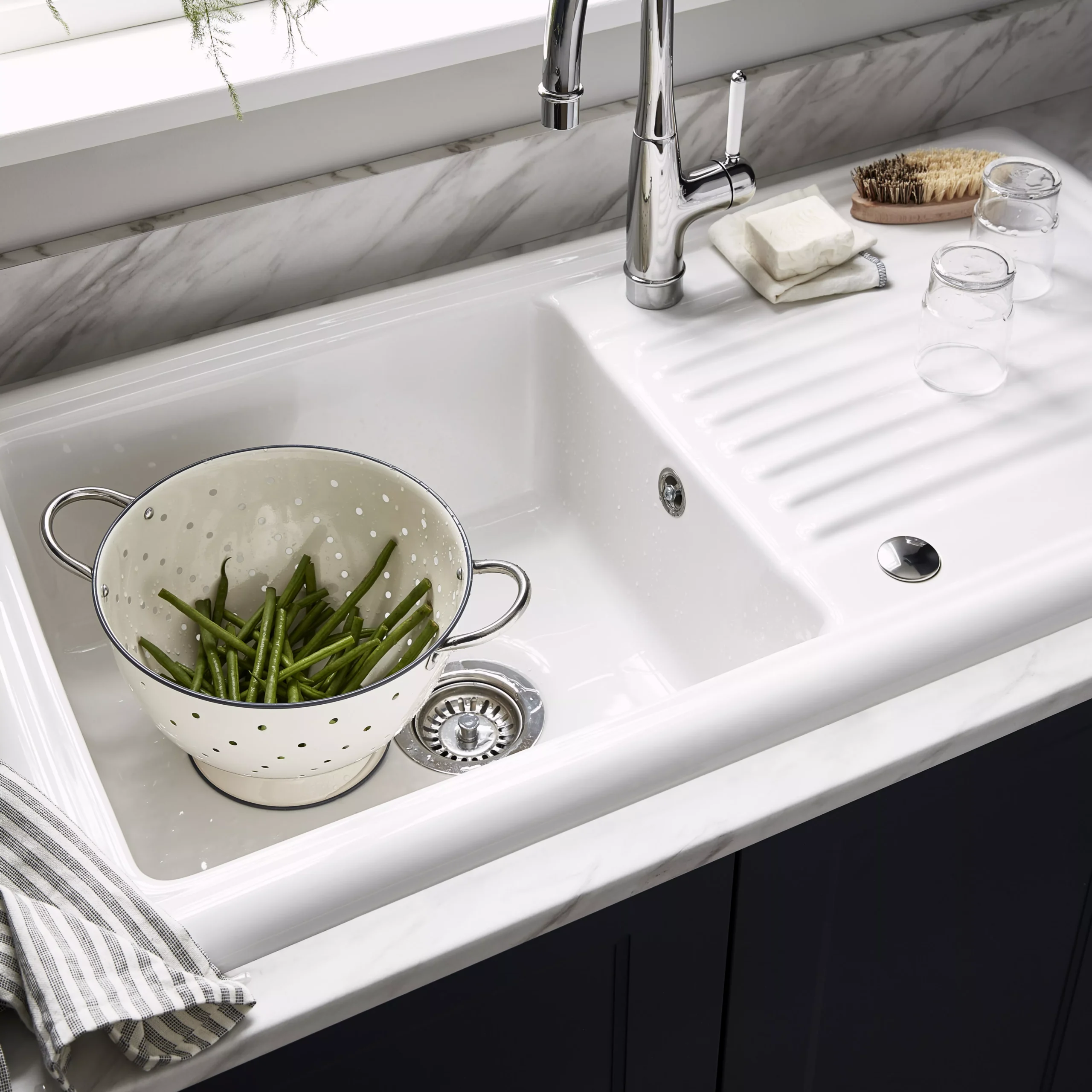 An essential addition to any kitchen, this white sink & drainer from Cooke & Lewis’s Burbank range is made from sturdy ceramic. It has 1 bowl, a reversible drainer and 1 tap hole, ready for you to add the taps of your choice.