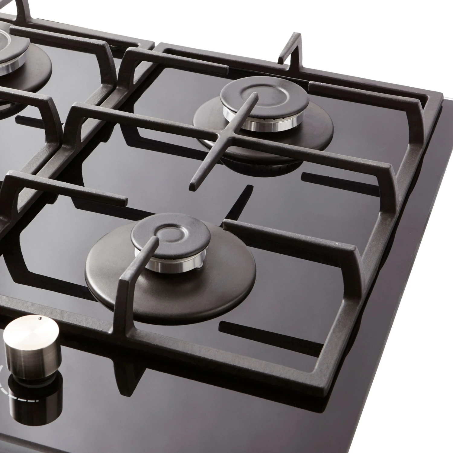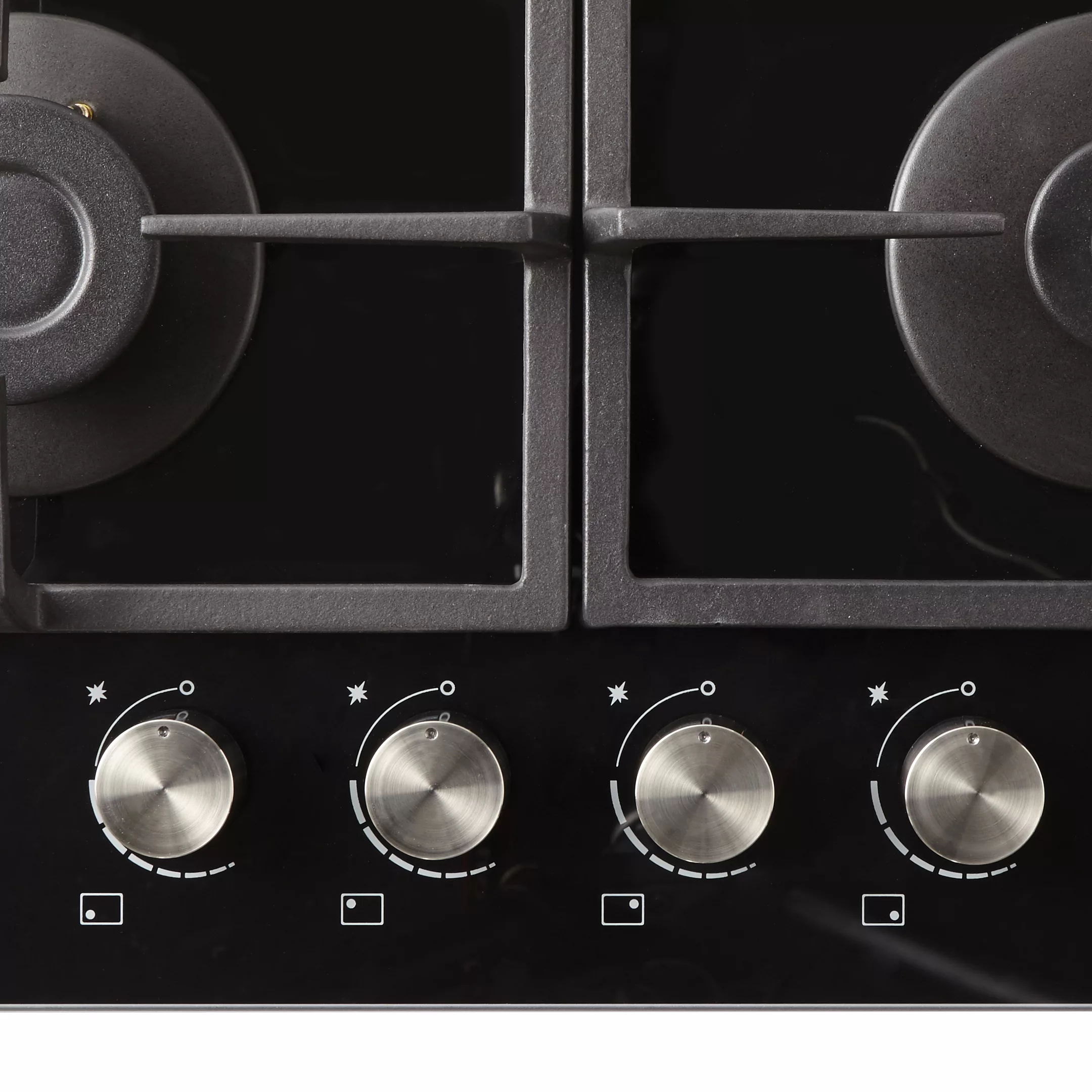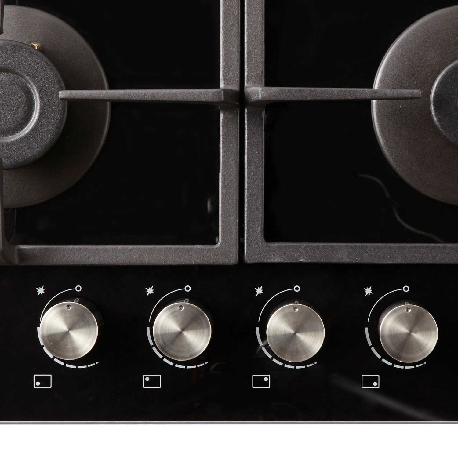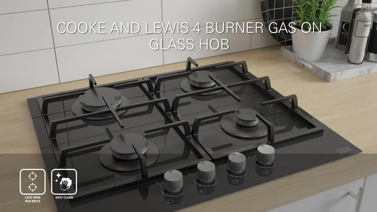- This sleek Gas on glass hob will add a real style statement to your kitchen space and the glass finish is easy to wipe clean. With 4 burners and pan supports for larger pans or wok’s this hob makes it easy to concentrate on a few dishes at once – a perfect addition to your kitchen!