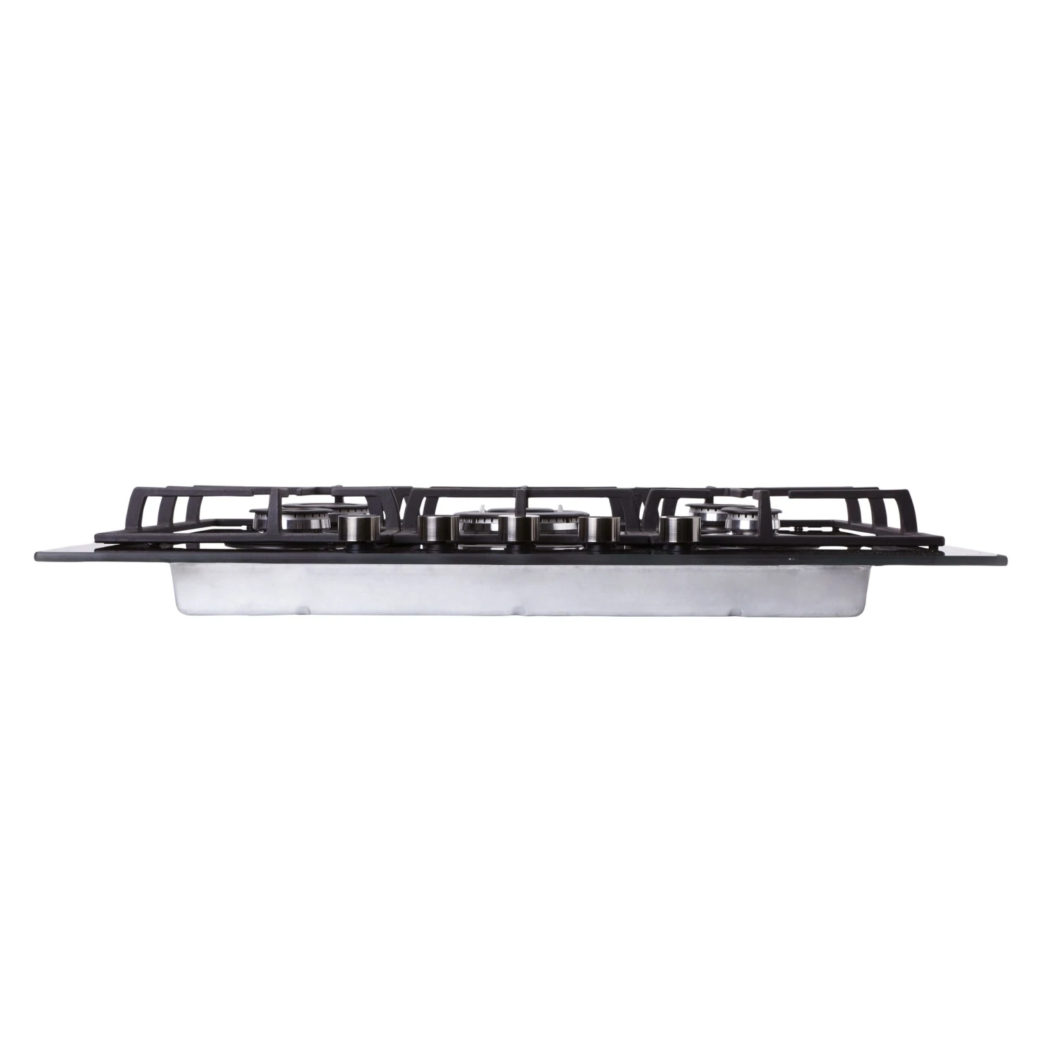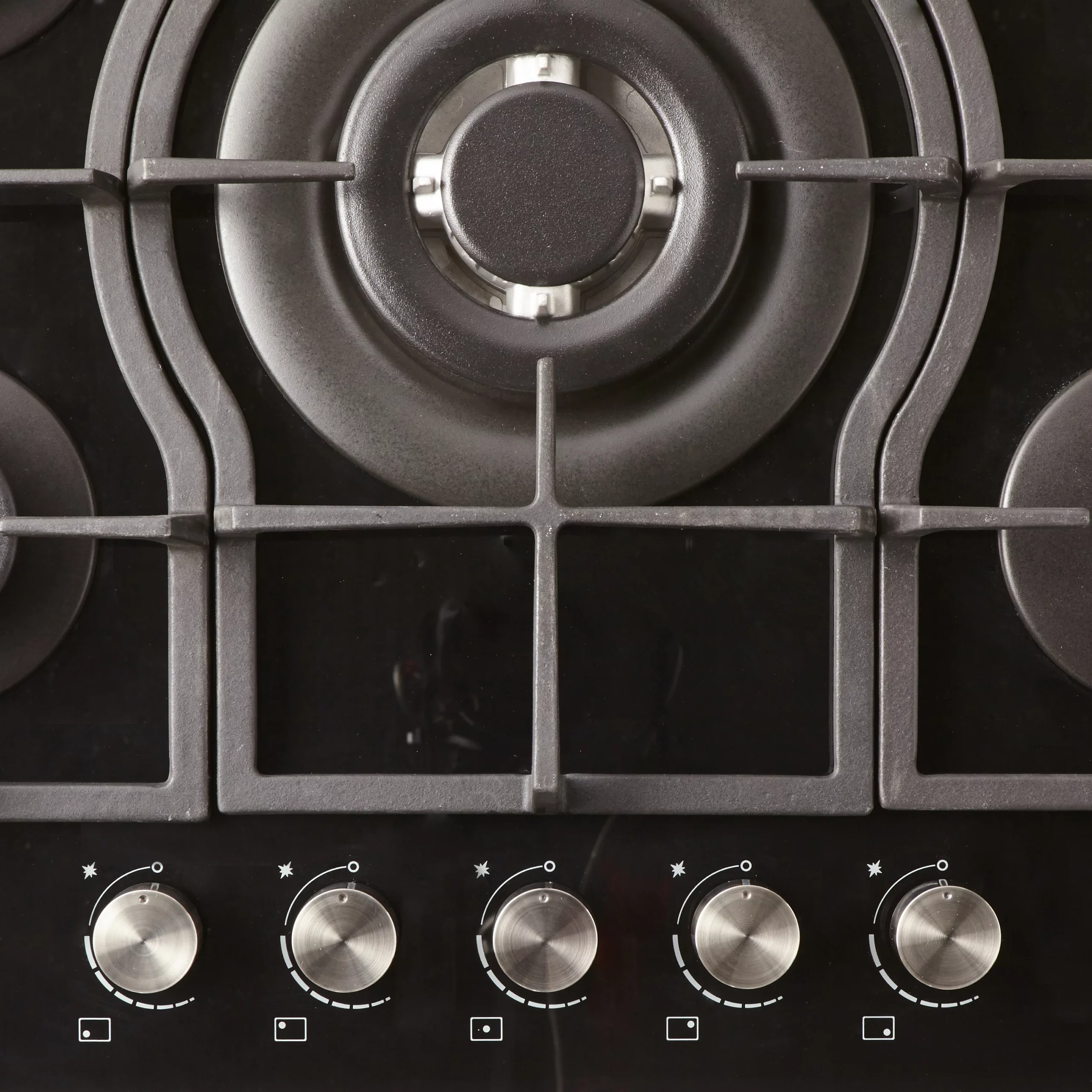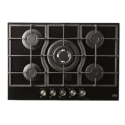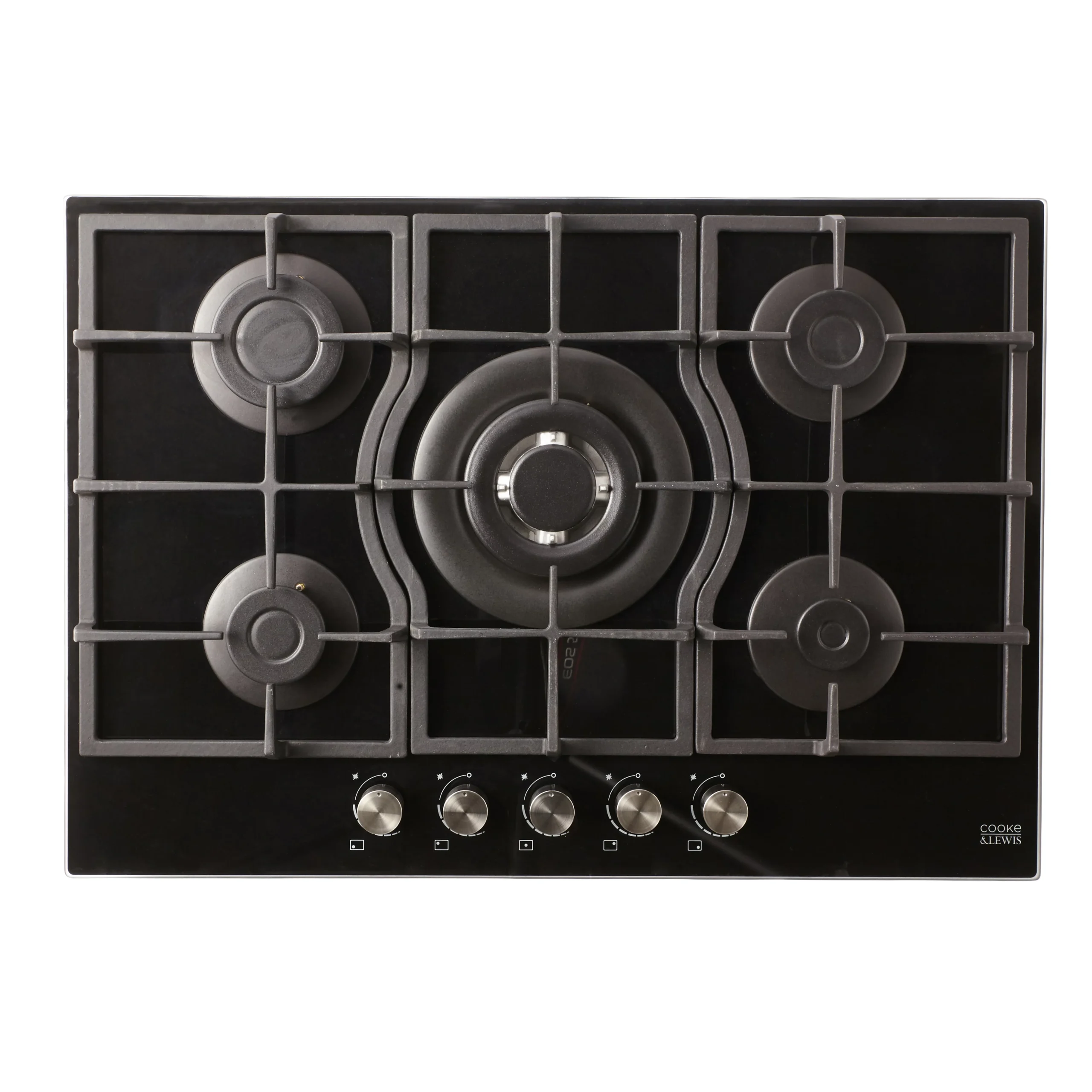- This sleek Gas on glass hob will add a real style statement to your kitchen space and the glass finish is easy to wipe clean. With 5 burners and pan supports for larger pans or wok’s this hob makes it easy to concentrate on a few dishes at once – a perfect addition to your kitchen!