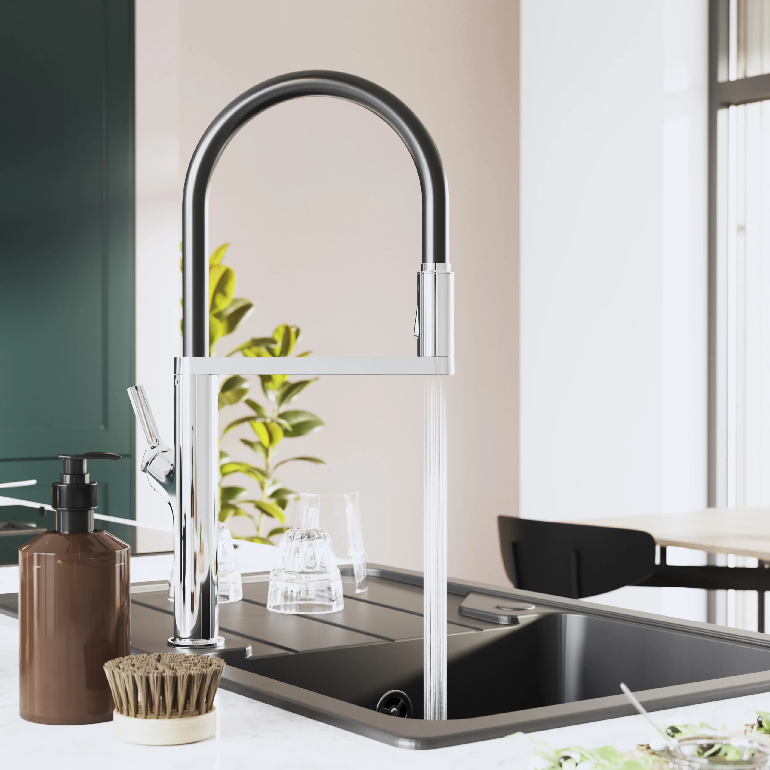 The Horopito chrome-plated spring neck kitchen tap features a sensor that allows contactless activation of water for improved hygiene. The spring neck spout helps you reach the corners of your sink making washing easier.