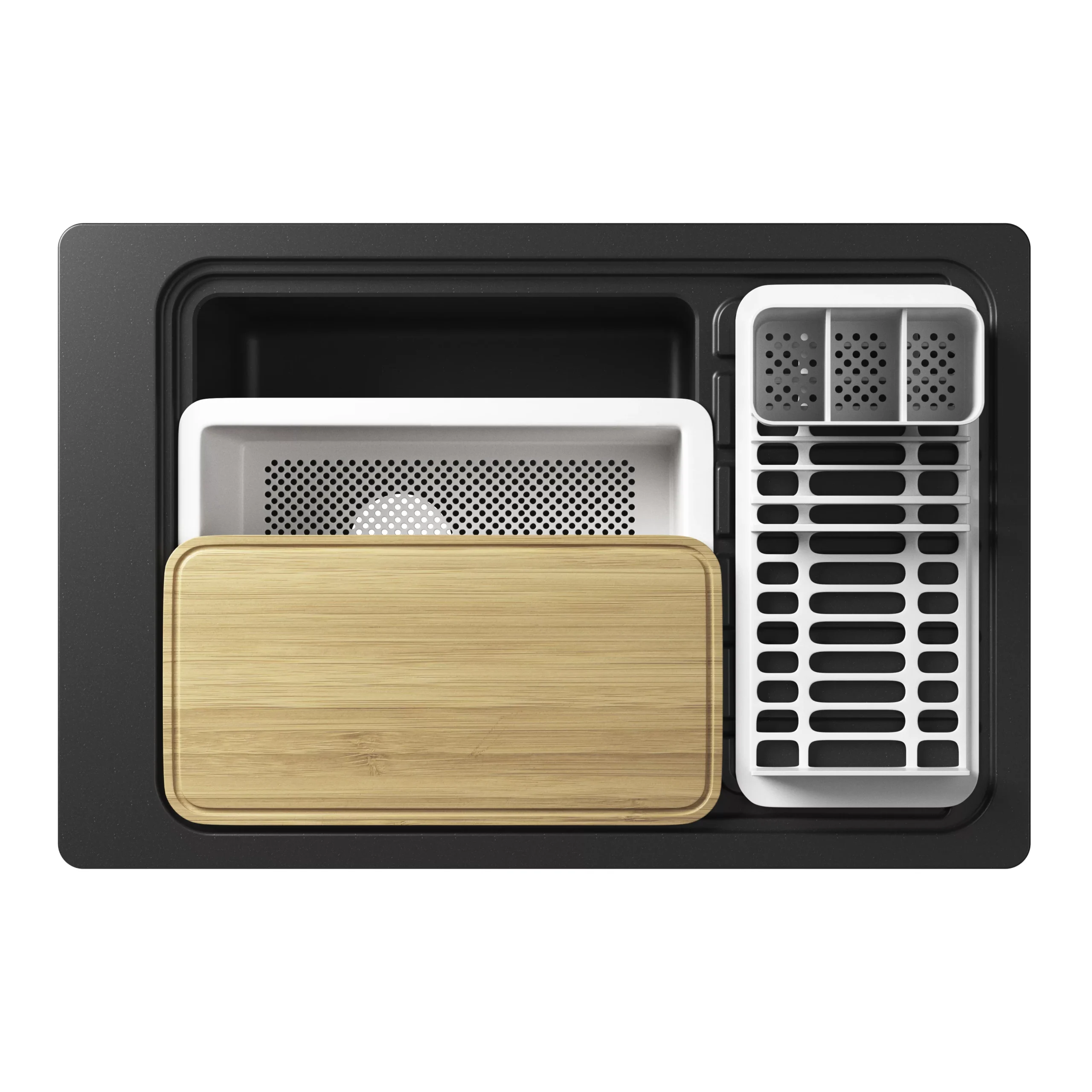 - Comes with Sink, sink fixing clips, instruction manual, Bamboo chopping board, colander, drying rack, cutlery holder, tap hole Cover