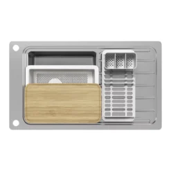 - Comes with Sink, sink fixing clips, sealing strip, instruction manual, bamboo chopping board, colander, drying rack, cutlery holder, tap hole cover