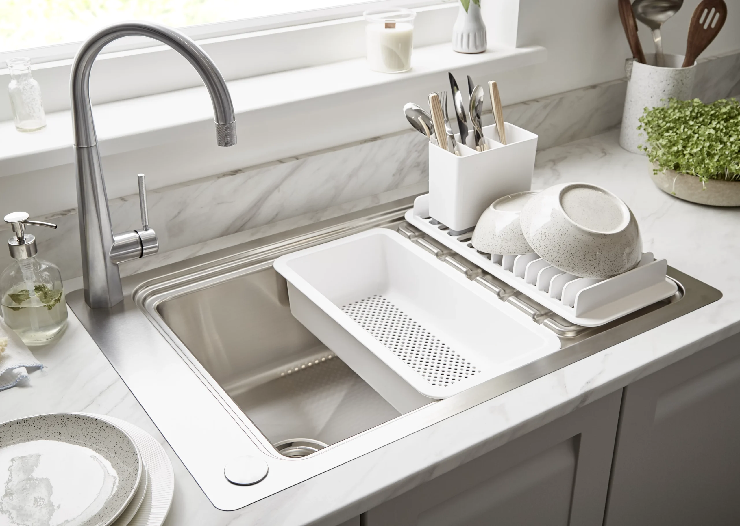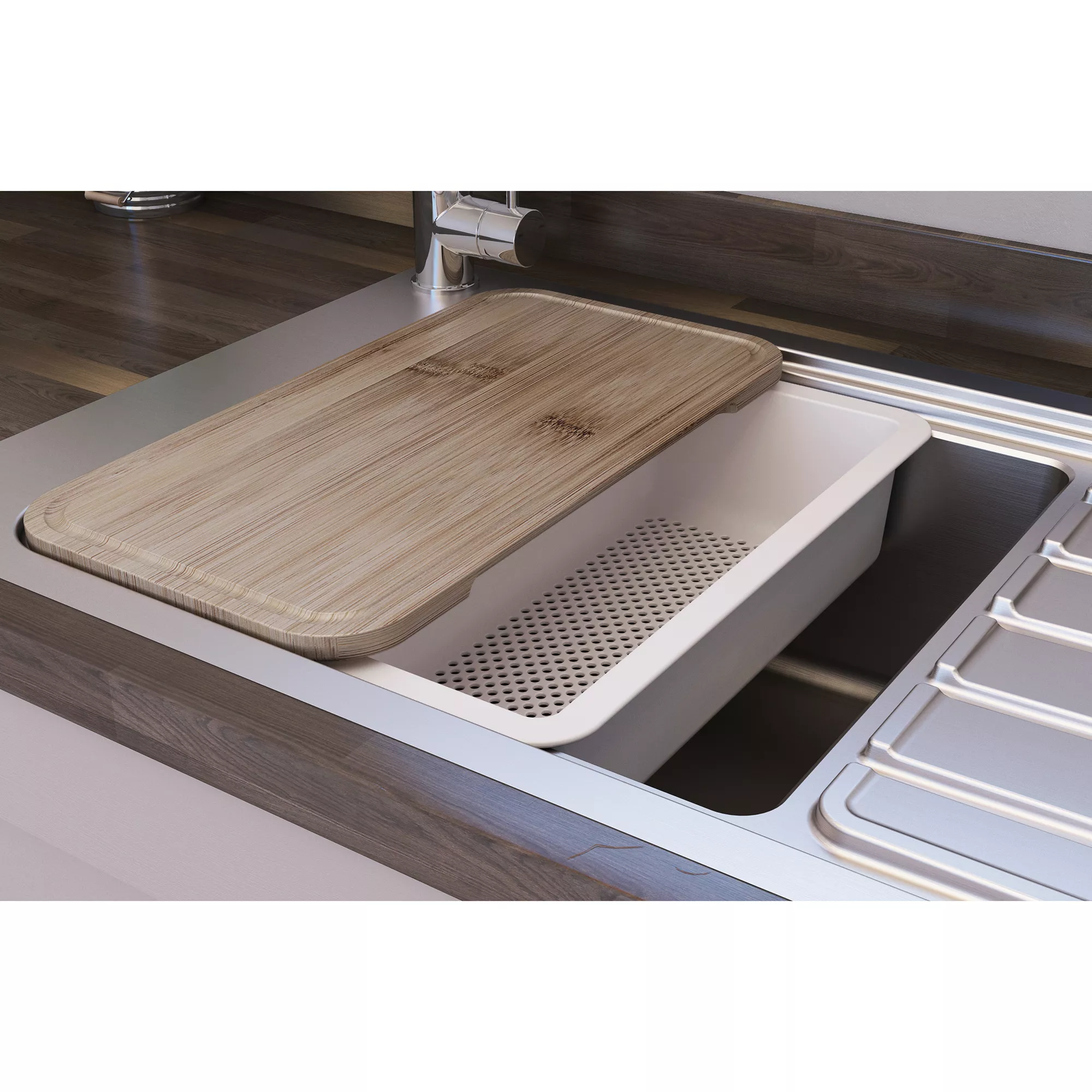 - This sink is designed with a double ledge rim, allowing accessories to be layered within the bowl for added functionality. The chopping board, colander and drying rack can be used either horizontally or vertically within the bowl, adding to the functionality of your sink and transforming how you use it every day