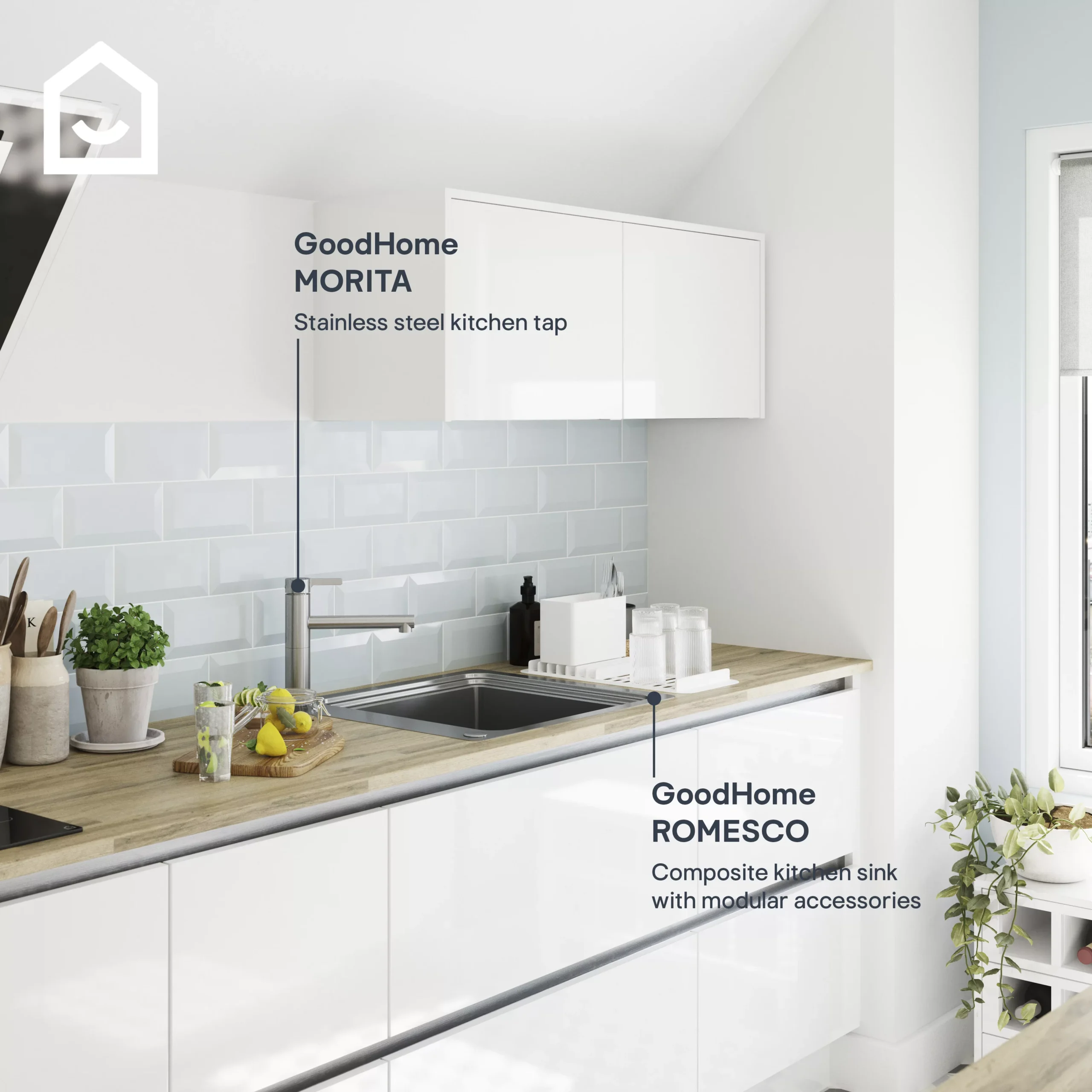 The Romesco sink from GoodHome maximises functionality and space with integrated modular accessories. This compact sink is ideal for small kitchens where you need to optimise workspace.