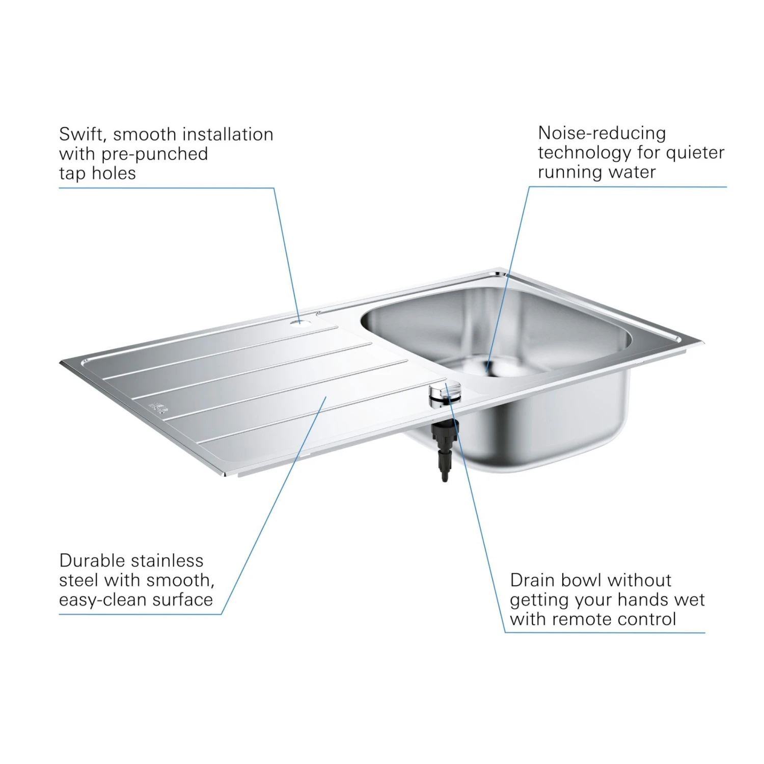 - The sink is made from GROHE StarLight AISI 304 grade stainless steel, meaning it is both durable and attractive with a sparkling finish