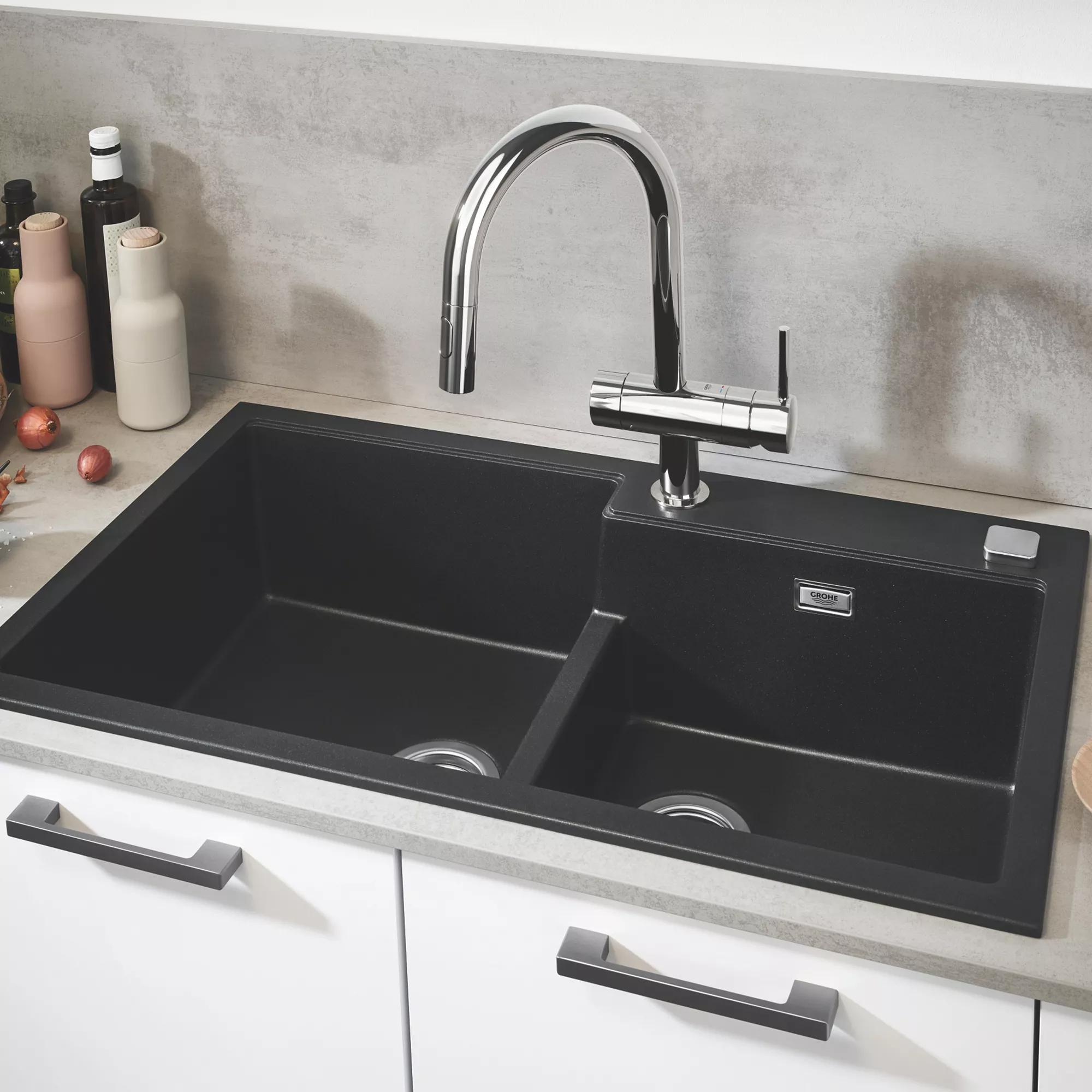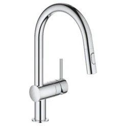 The Minta chrome effect pull-out mixer tap, from Grohe, fuses the visual clarity of its slender swivel spout with the convenience of a pull-out rinsing spray. The elegant lever handle benefits from GROHE SilkMove technology – for smooth operation and fingertip control, while GROHE StarLight chrome guarantees a pristine finish for years to come.