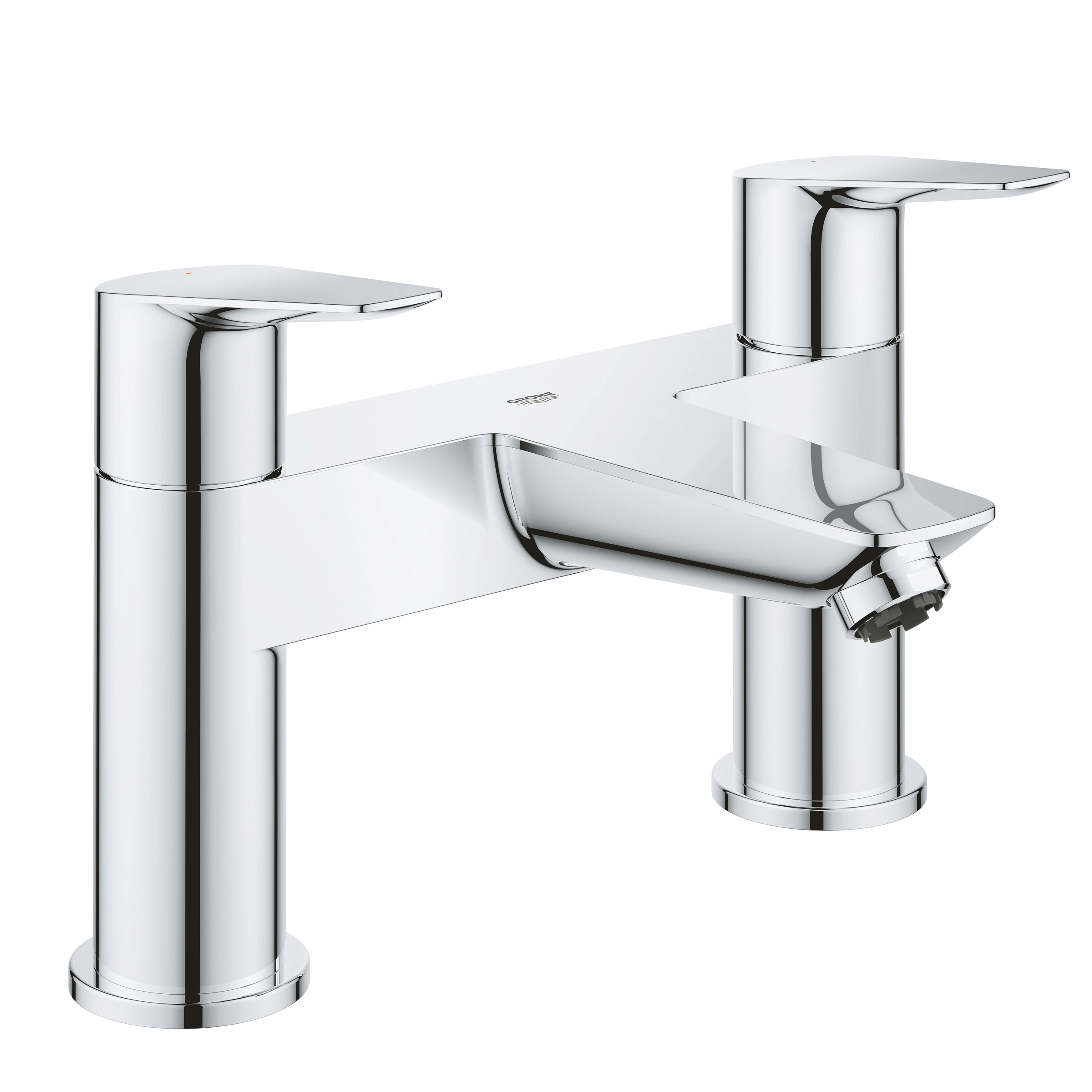 Deck-mounted, modern bath filler with StarLight chrome finish, offering stylish appearance and easy cleaning. Features solid metal handles and ¼ turn ceramic valves. Supplied with waste and suitable for all water pressures.