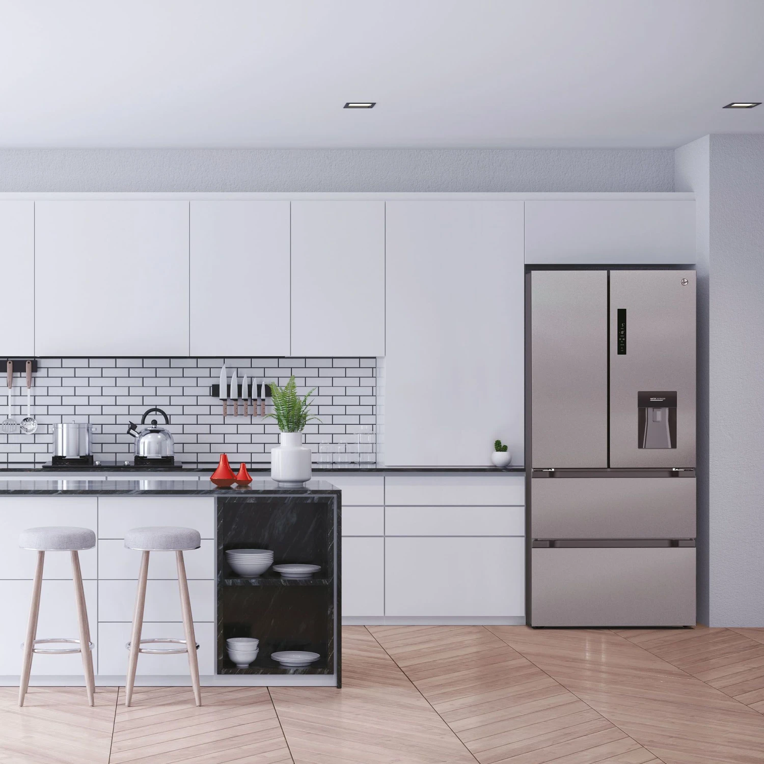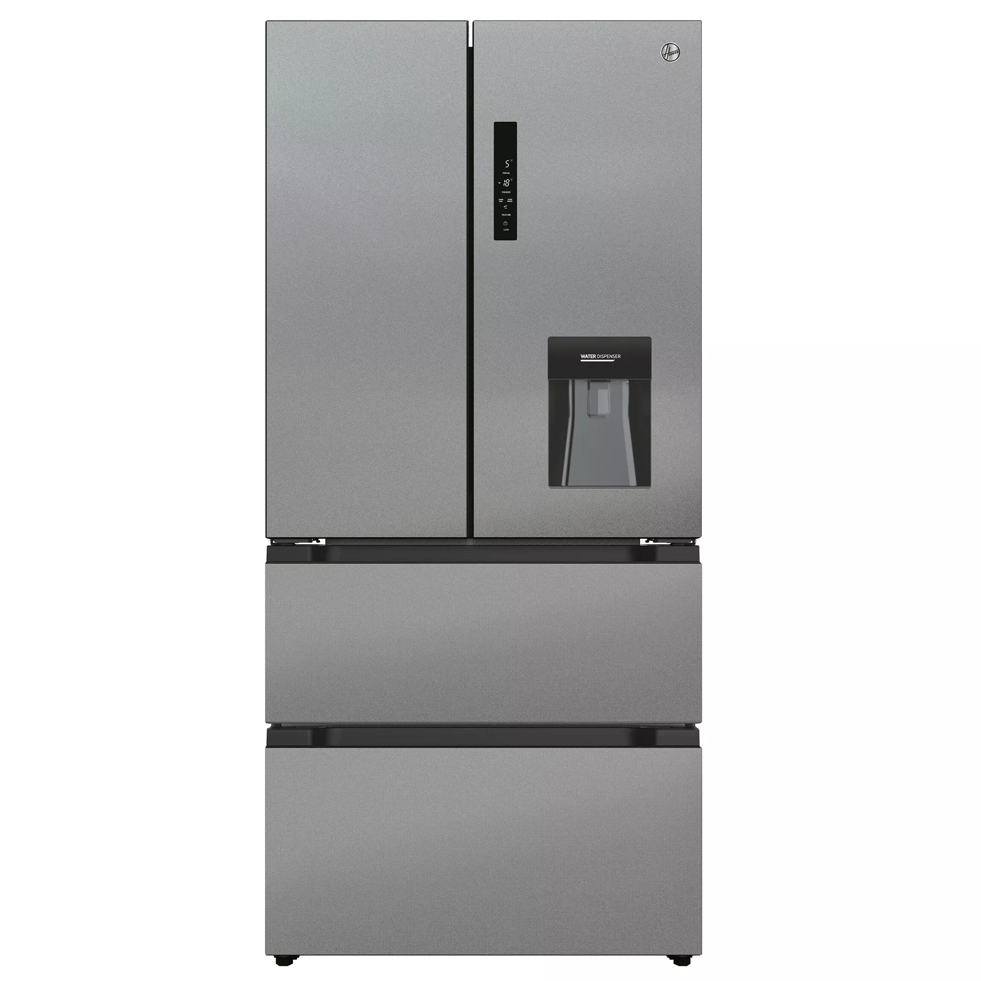 This Hoover American fridge freezer has enough space for 16 bags of fresh food and 8 bags of frozen food. Enjoy refreshing drinks with the non-plumbed water dispenser. The No Frost tech moves air around in both fridge and freezer so ice won’t build up.