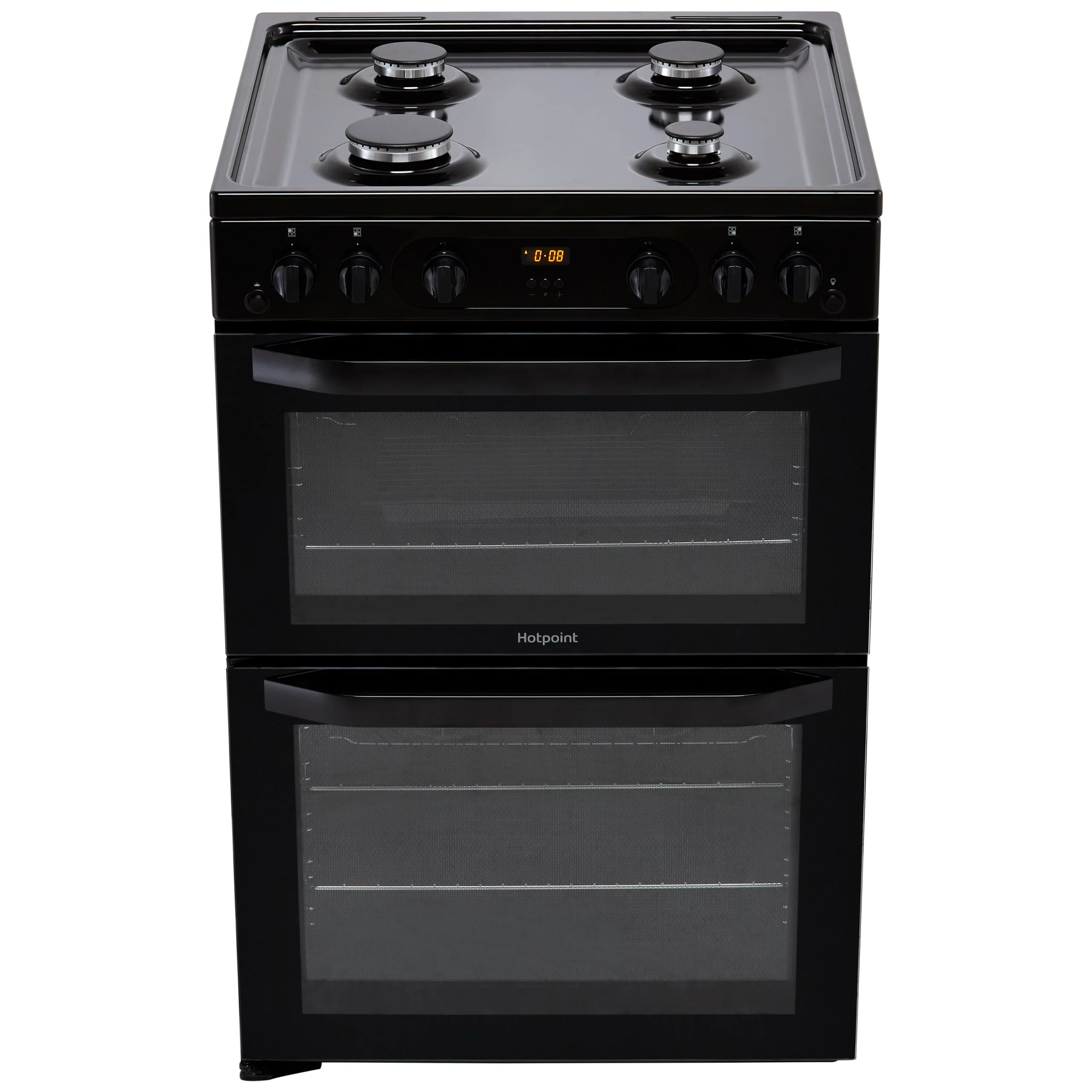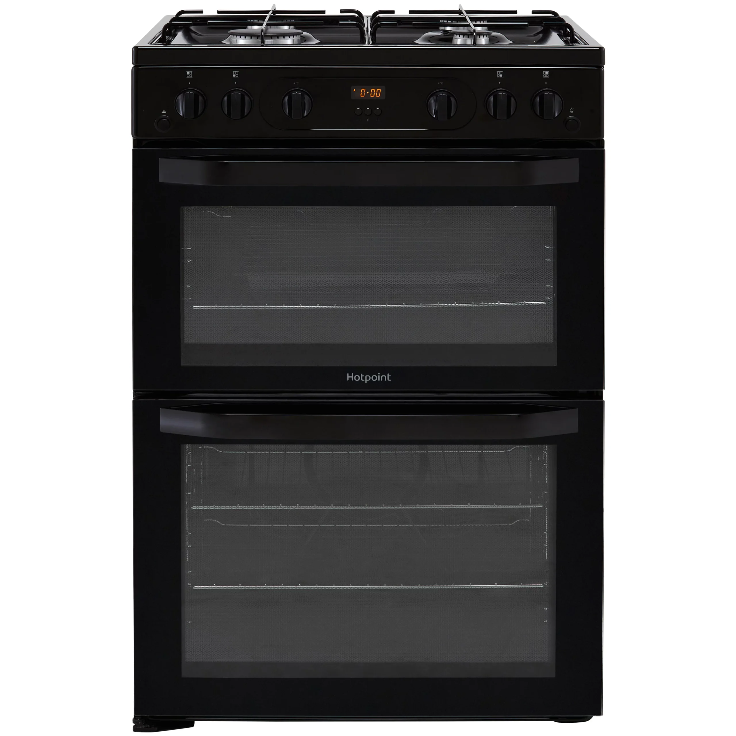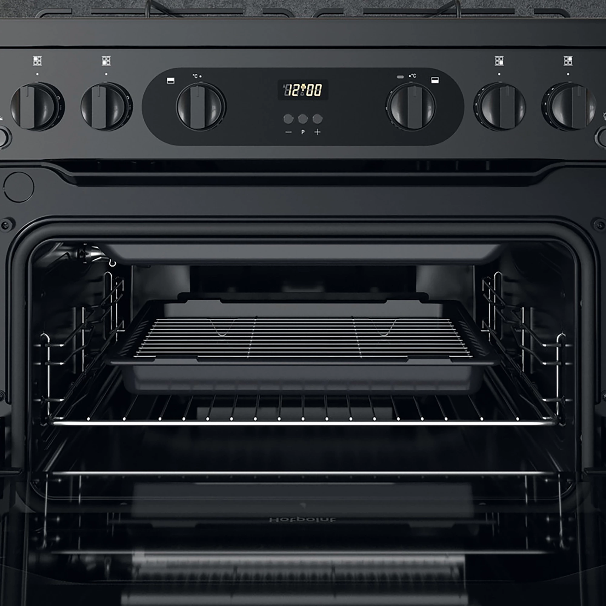 This black Hotpoint HDM67G0CCW/UK_WH gas cooker with a gas hob has what you need for a delicious meal that everyone will enjoy. There are two ovens with plenty of space to cook a dinner and dessert at the same time, and a grill function which is perfect for making a quick snack.