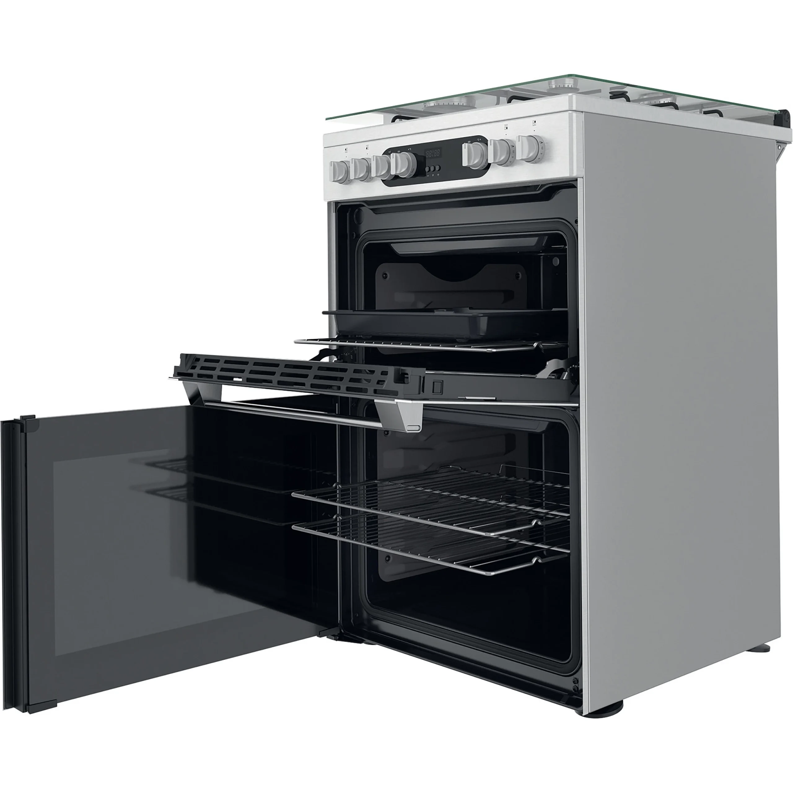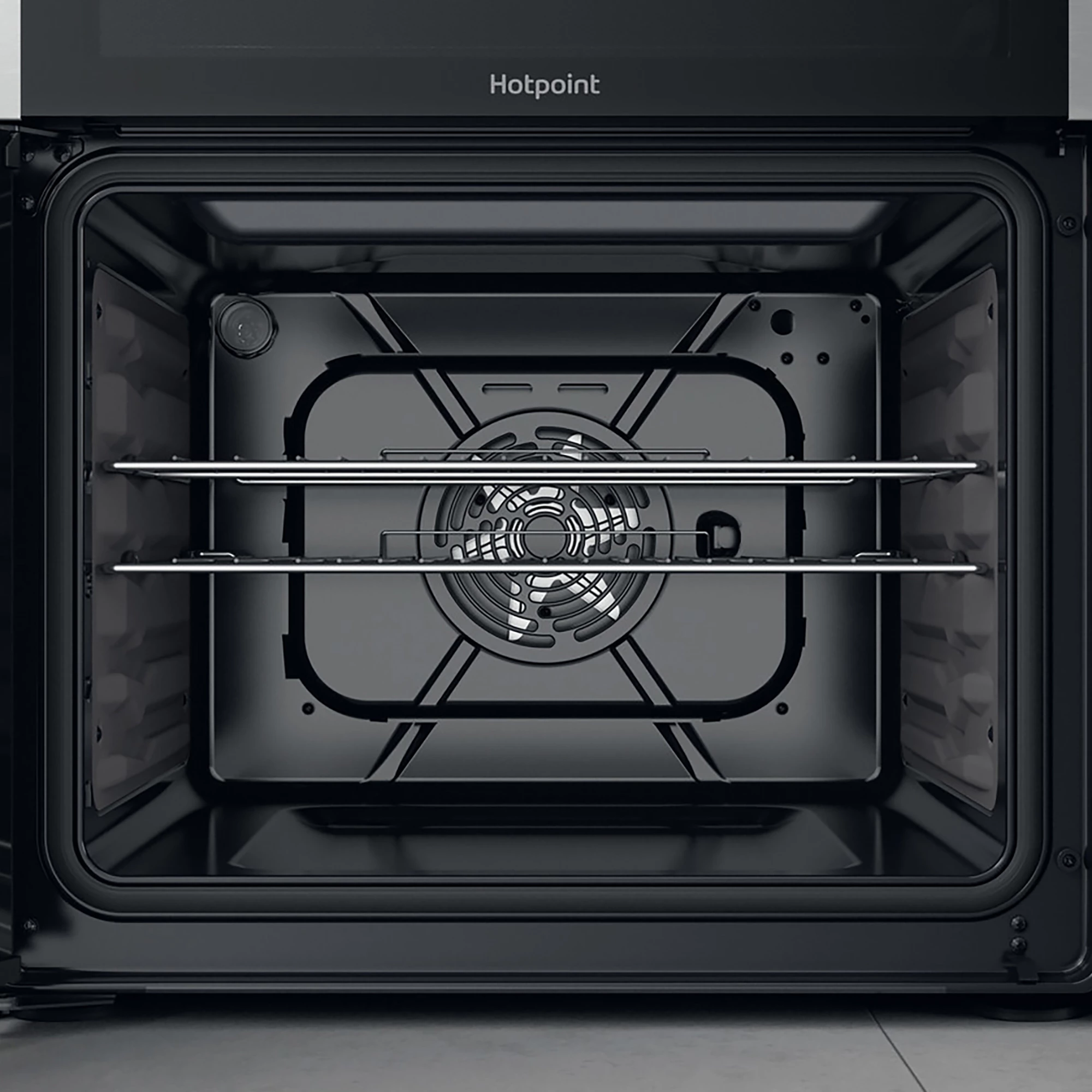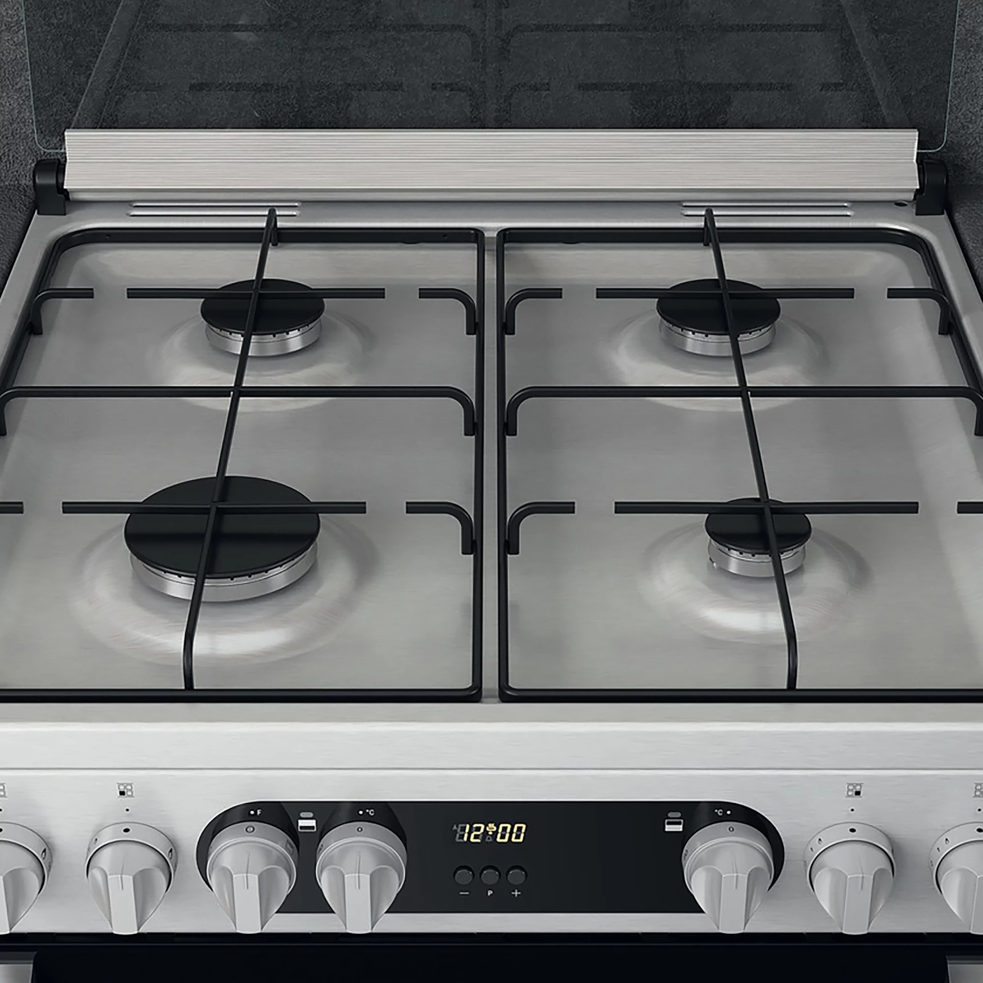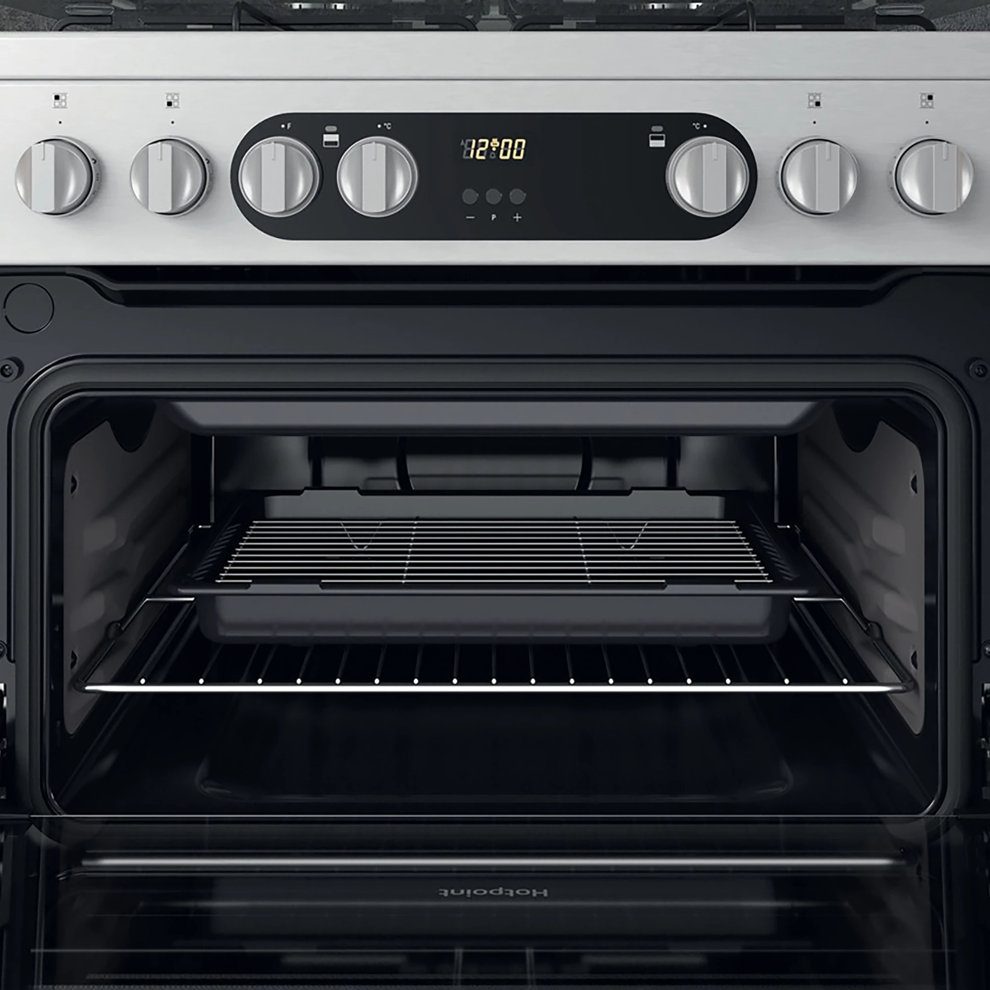 The double oven and 4-zone gas hob on this HDM67G9C2CX/U_SI Hotpoint dual fuel cooker is ideal for cooking up a storm, whipping up a delicious meal that’ll bring the whole family together. Not only does it have a multifunctional main oven that will make light work of meal prep and a grill setting on the second oven for a quick toastie, it has special liners that absorb grease so there’s less scrubbing if there’s any mess.