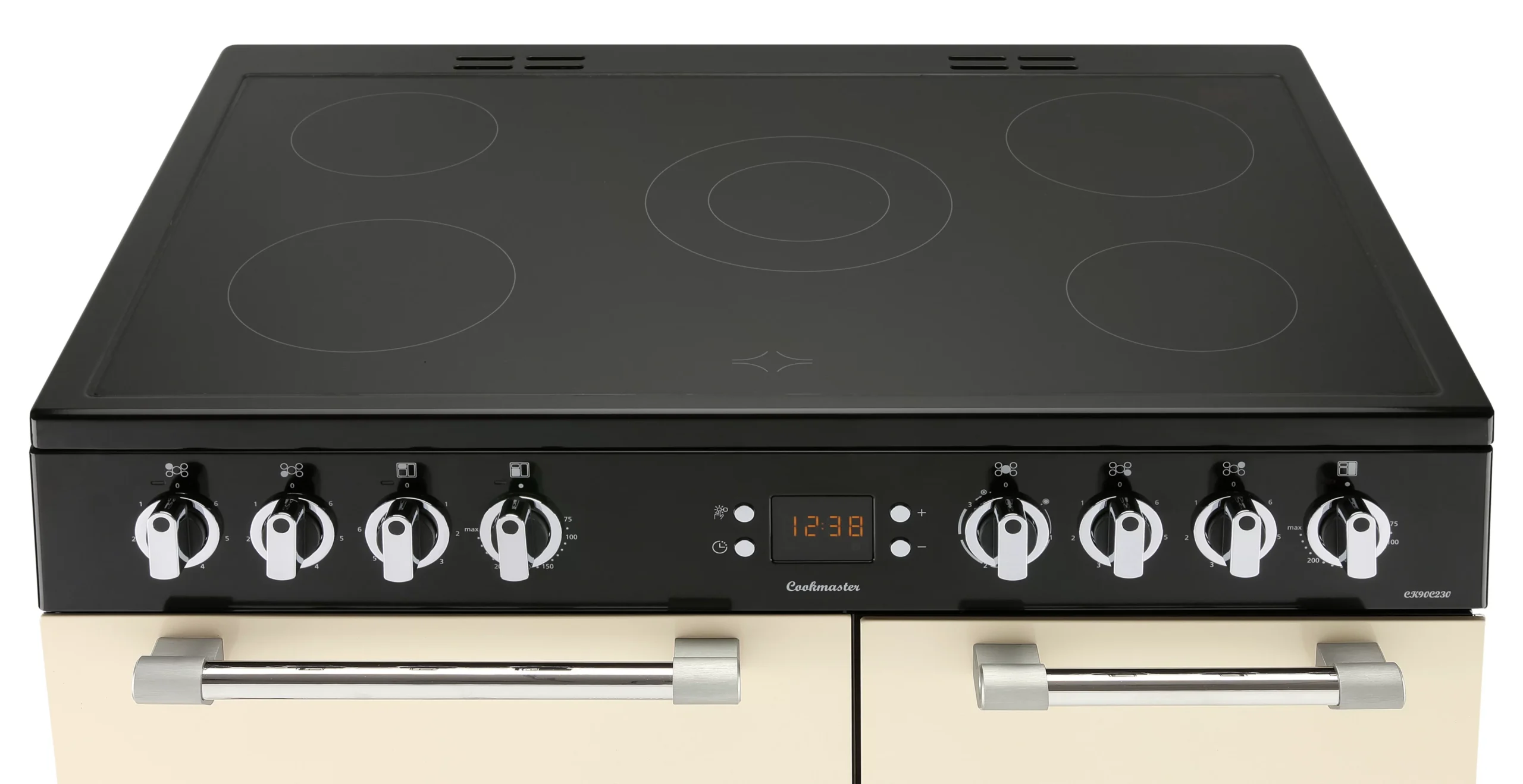 This 90cm Cookmaster electric range cooker combines a range of great features with stylish design that will make a stunning style statement in any kitchen. With tonnes of oven space and 5 hob burners it is ideal for large families, keen bakers and those that love to entertain as it makes juggling a number of dishes a breeze. The easy grip knobs, internal lights and timer display gives you complete control and flexibility, this really is the perfect addition to any modern kitchen.