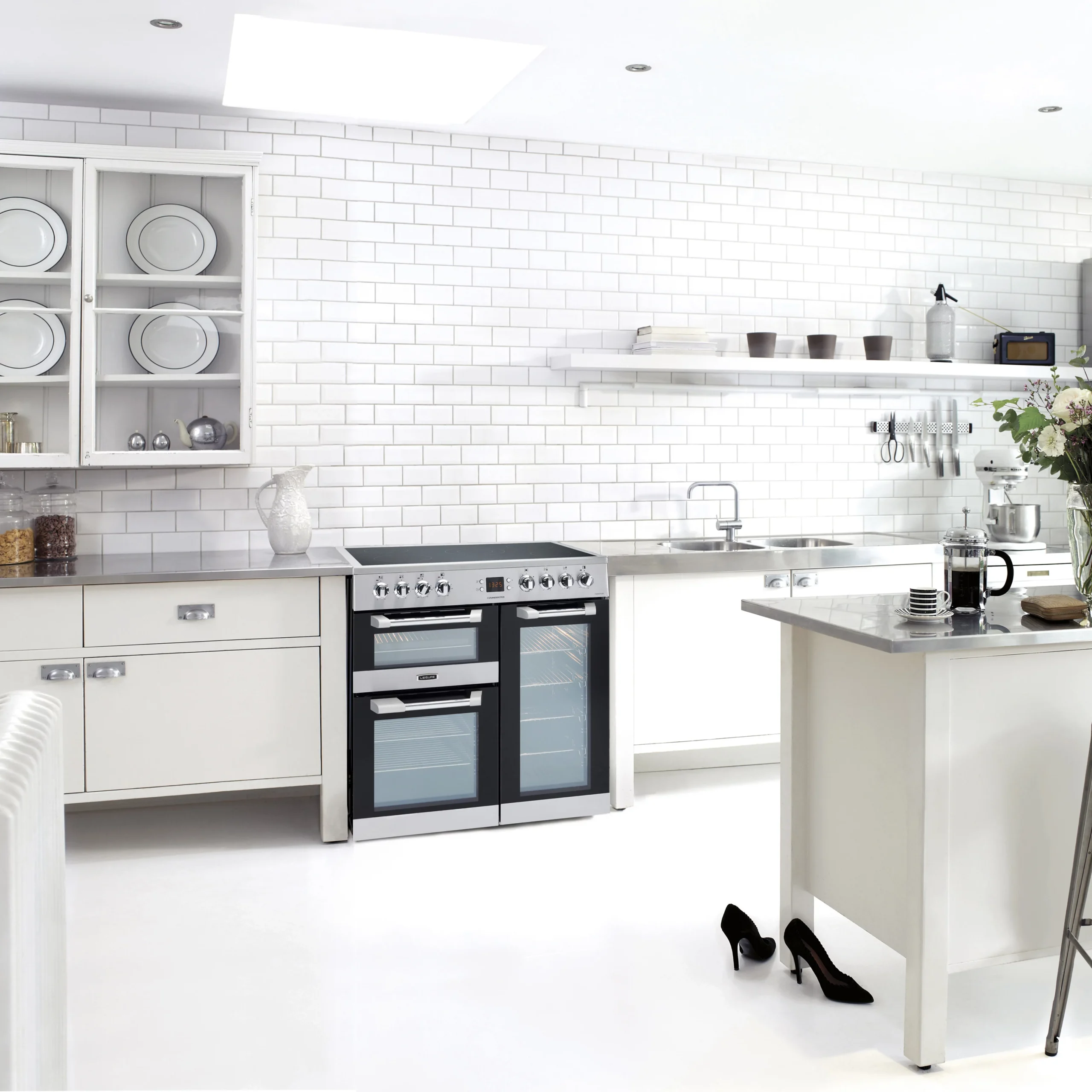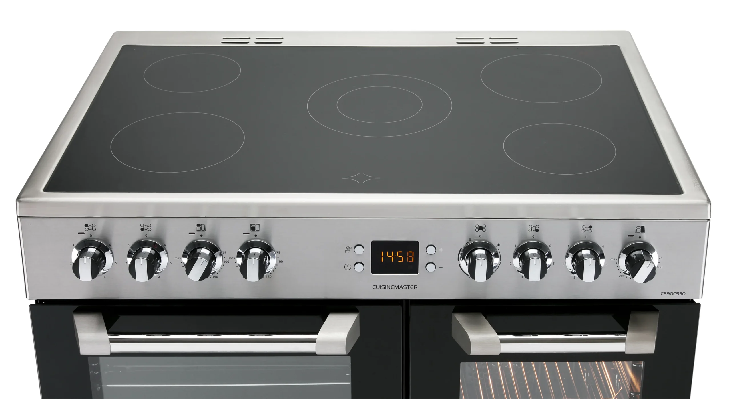 This 90cm Cuisinemaster electric range cooker combines a range of great features with stylish design that will make a stunning style statement in any kitchen. With tonnes of oven space and 5 hob burners it is ideal for large families, keen bakers and those that love to entertain as it makes juggling a number of dishes a breeze. The easy grip knobs, internal lights and timer display gives you complete control and flexibility this really is the perfect addition to any modern kitchen.