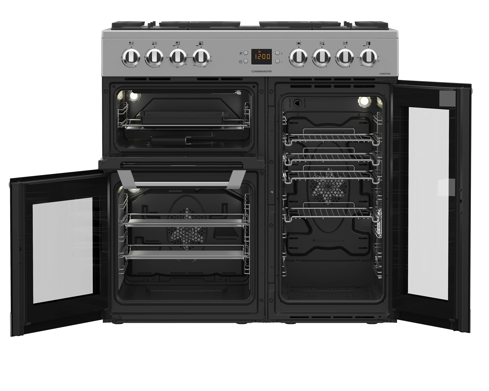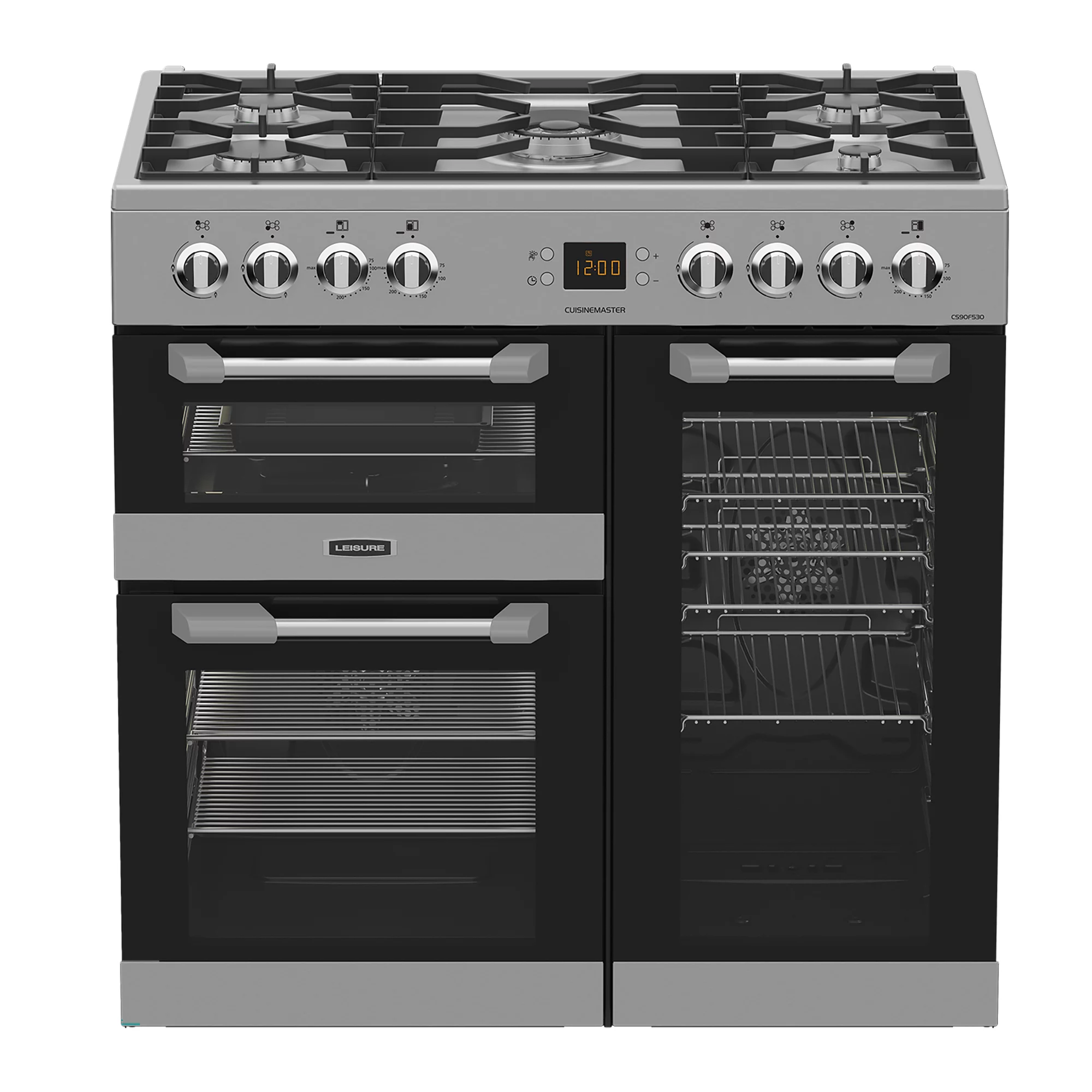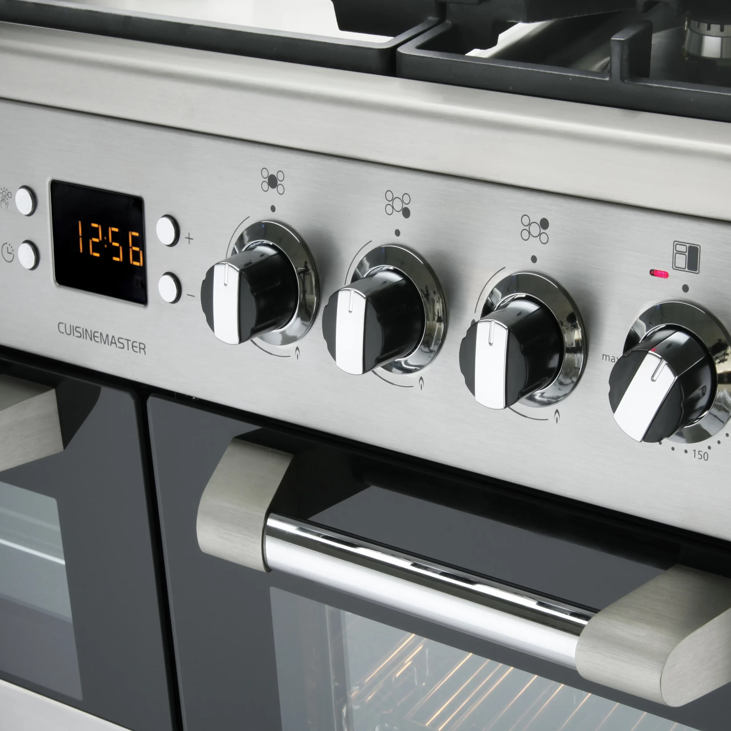 This 90cm Cuisinemaster dual fuel range cooker combines a range of great features with stylish design that will make a stunning style statement in any kitchen. With tonnes of oven space and 5 hob burners it is ideal for large families, keen bakers and those that love to entertain as it makes juggling a number of dishes a breeze. The easy grip knobs, internal lights and timer display gives you complete control and flexibility, this really is the perfect addition to any modern kitchen.