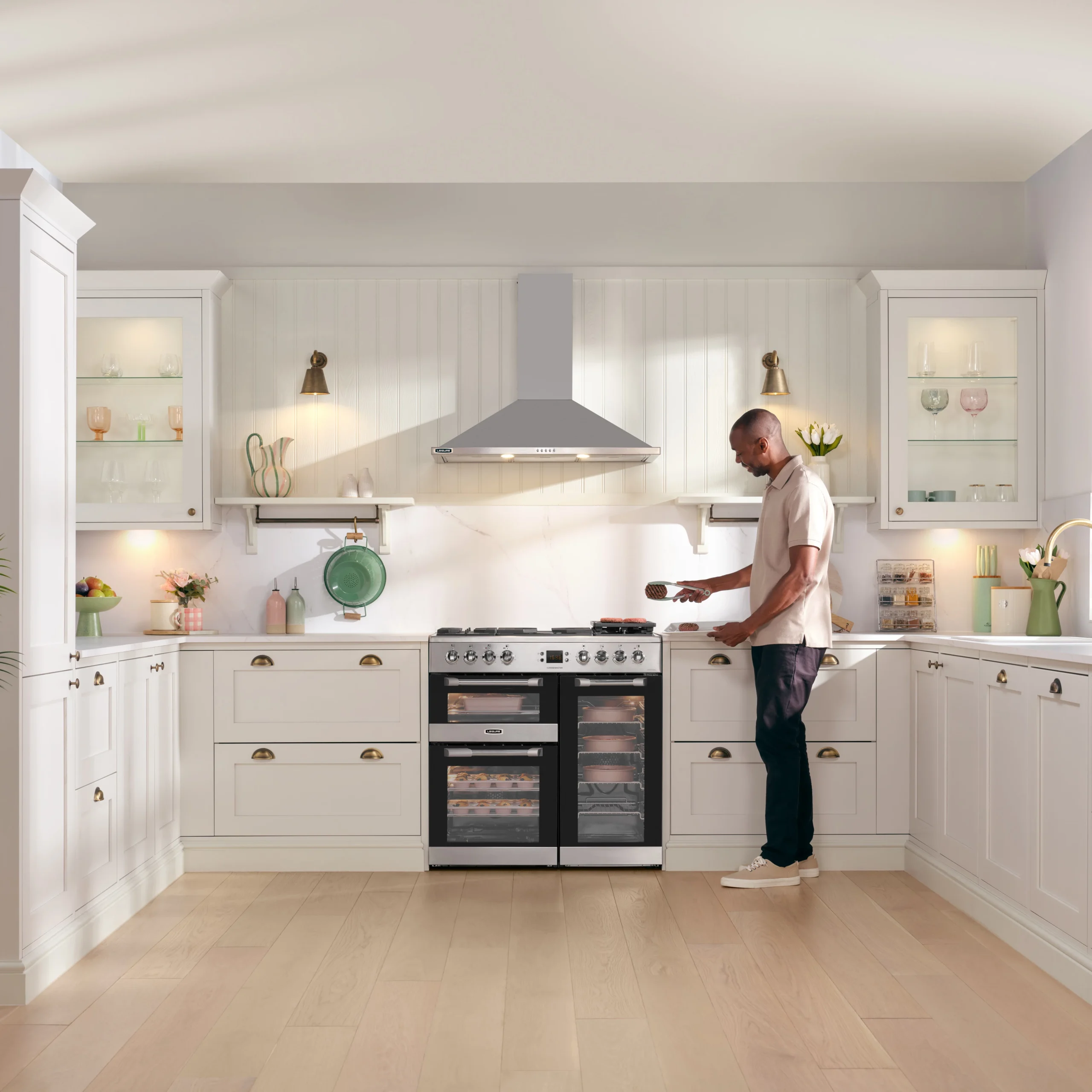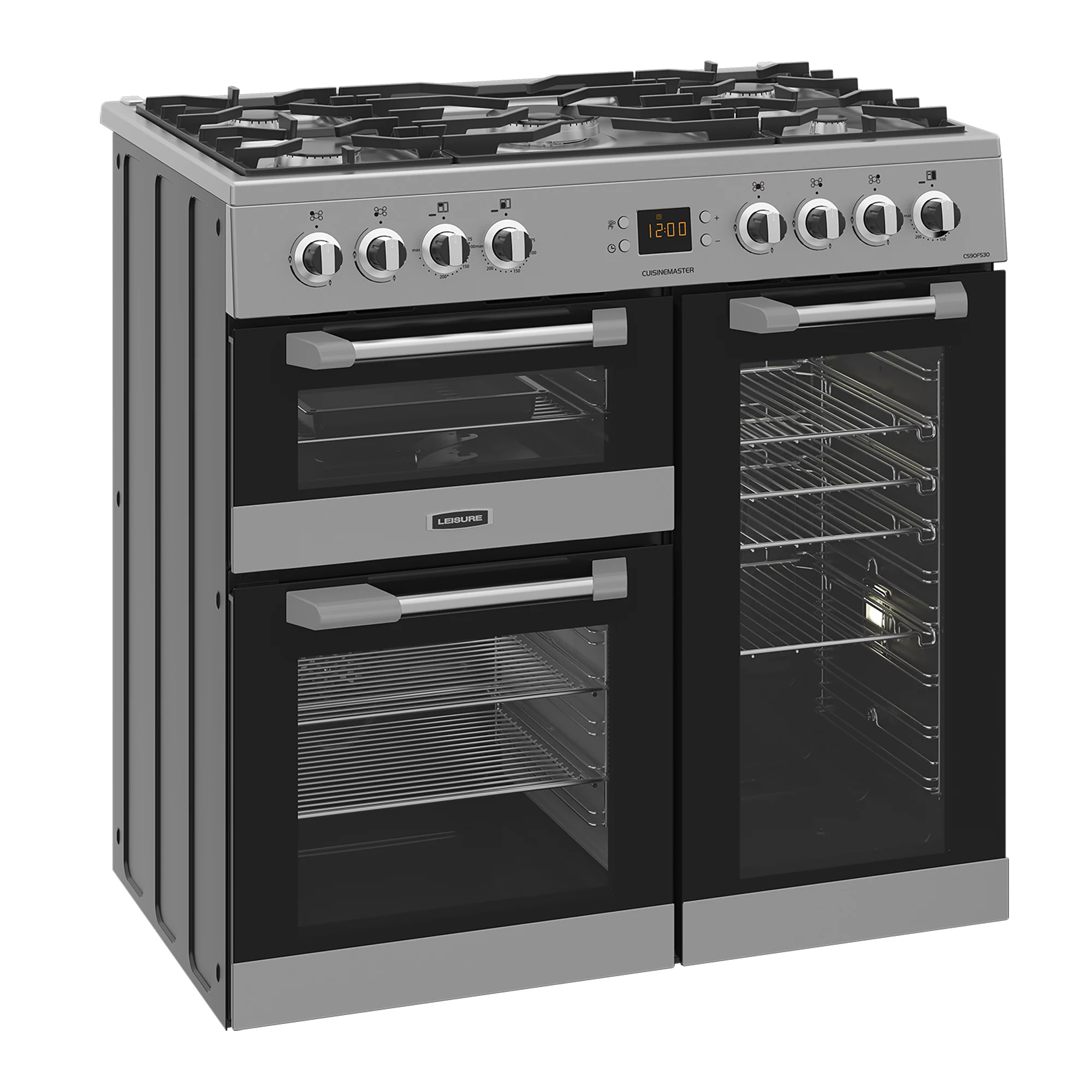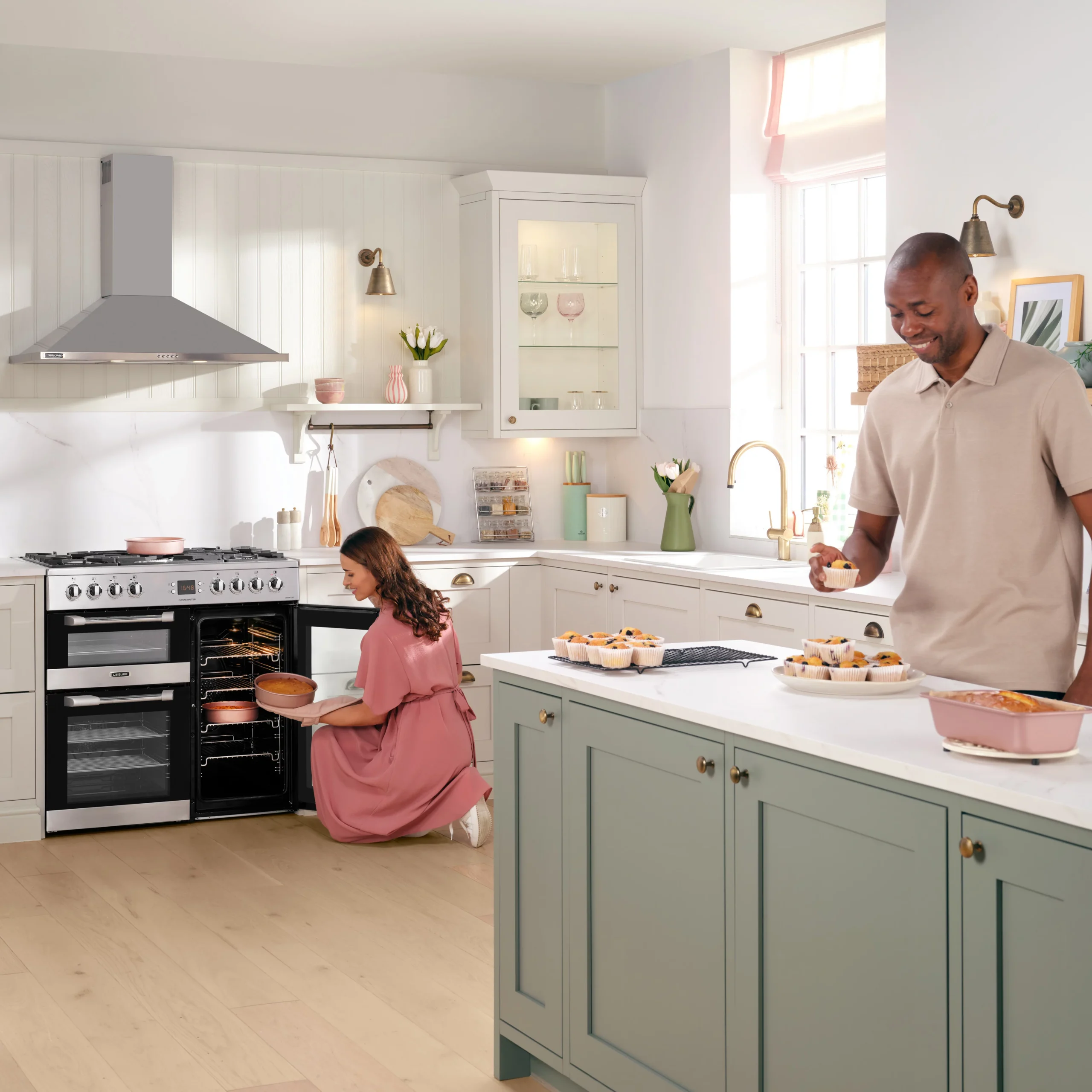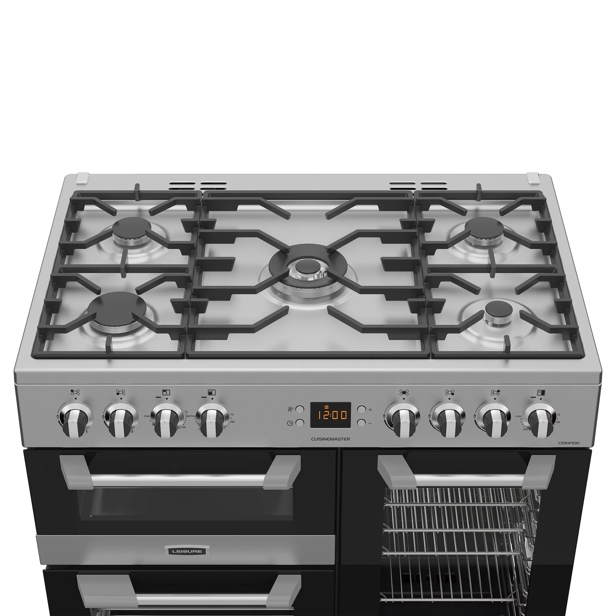 This 90cm Cuisinemaster dual fuel range cooker combines a range of great features with stylish design that will make a stunning style statement in any kitchen. With tonnes of oven space and 5 hob burners it is ideal for large families, keen bakers and those that love to entertain as it makes juggling a number of dishes a breeze. The easy grip knobs, internal lights and timer display gives you complete control and flexibility, this really is the perfect addition to any modern kitchen.