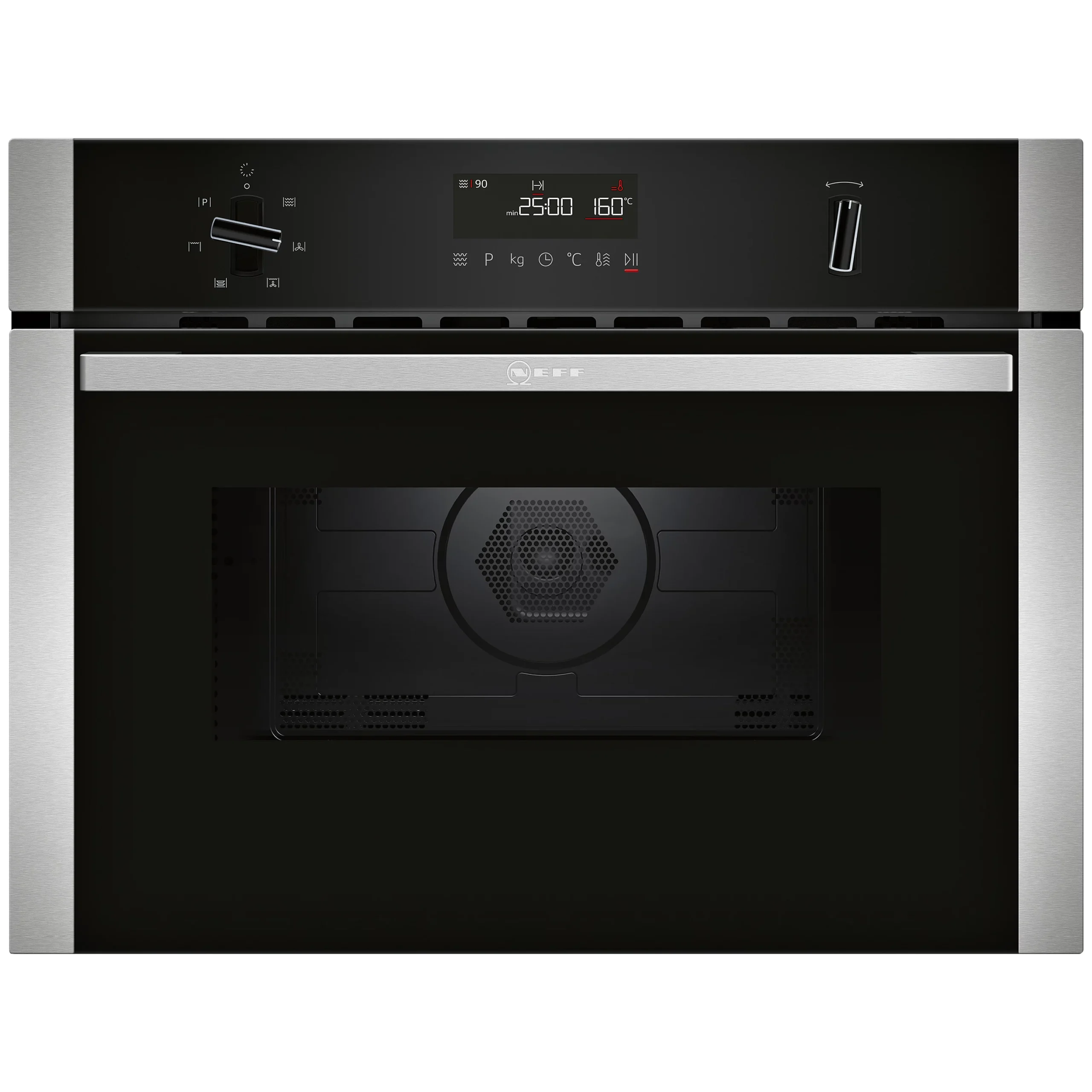 Neff N50 Built-in compact oven with microwave function in black glass and stainless steel.